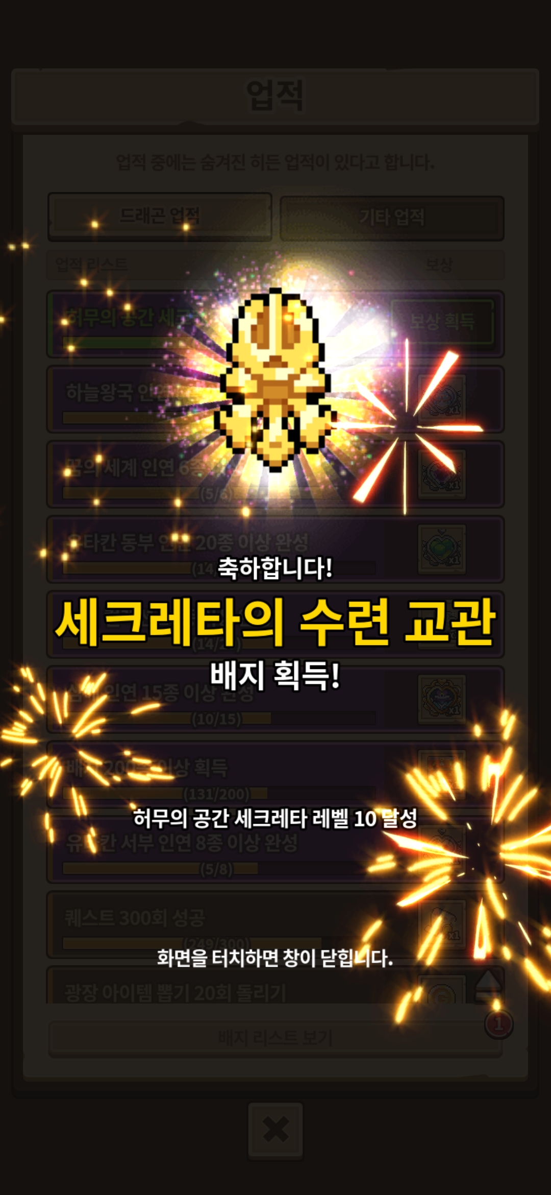 사진을 보면 아시겠지만 허무의 공간에서 오르도 10렙 달성했음에도 세크레타의 수련 교관 배지가 지급되는 오류가 있습니다. 확인 후 수정 부탁드립니다.