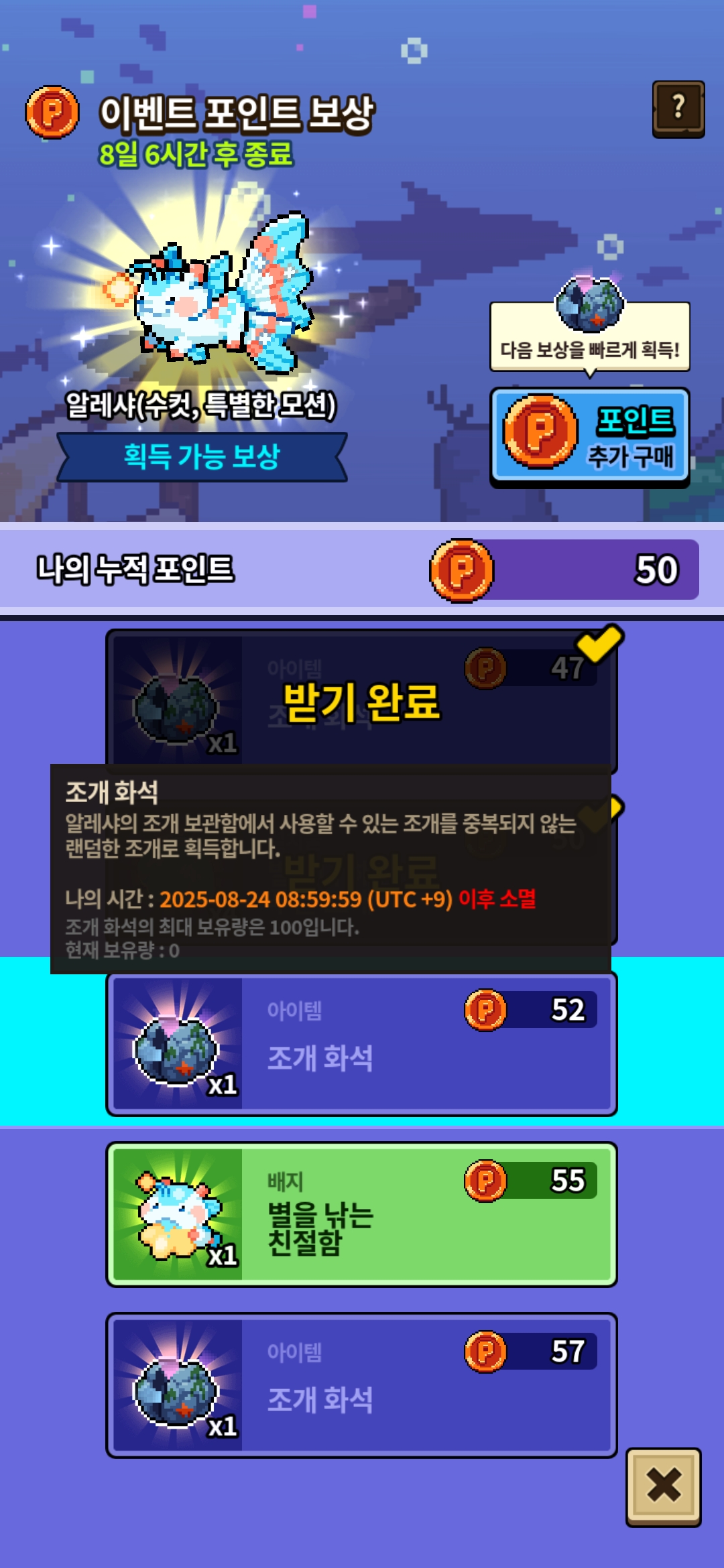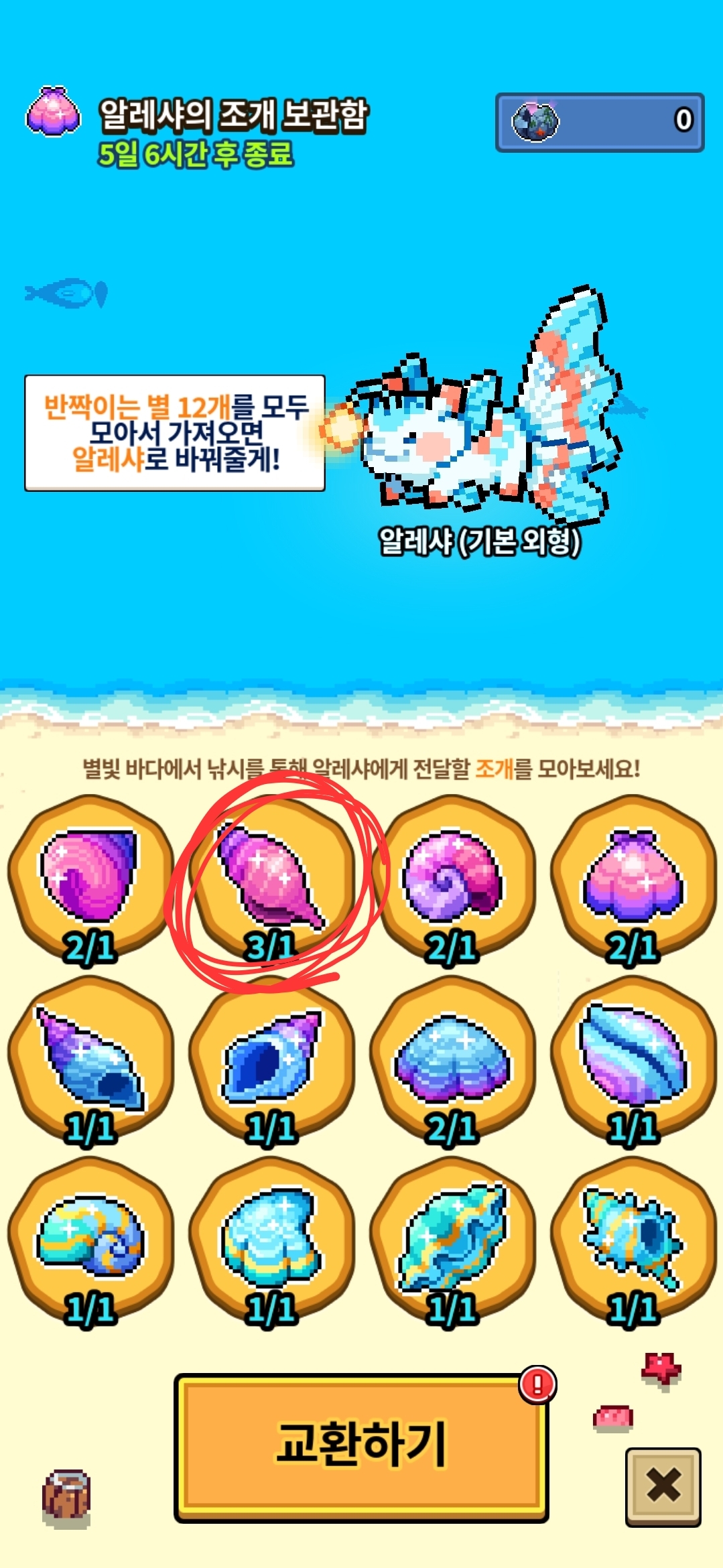 실제로 12개의 화석을 다 모은 후에 조개 화석 사용시..