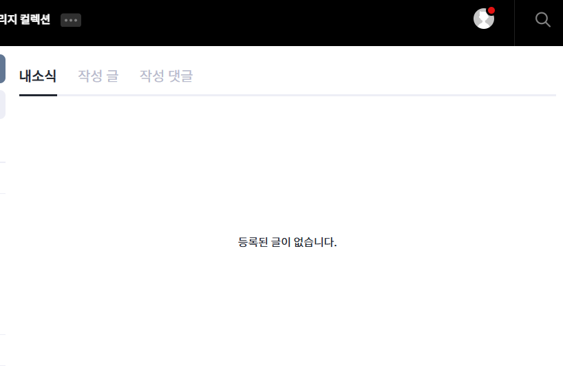 게시판 알림 아이콘이 제대로 작동하지 않는 것 같습니다. '내소식' 섹션이 비어 있습니다.