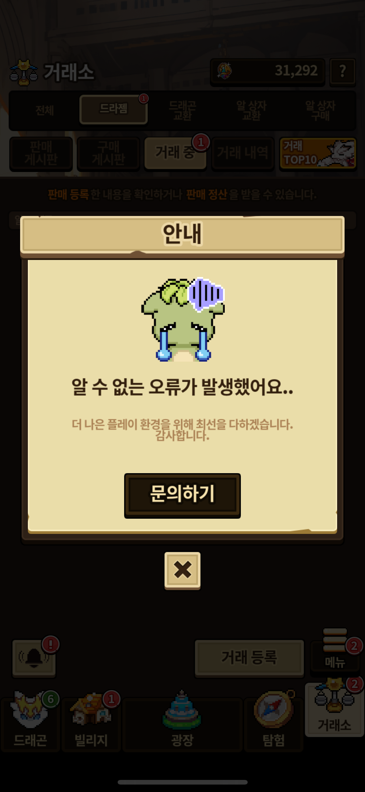 거래소에 판매 완료된 드라잼을 받으려고 들어가면 계속 저 팝업이 뜨고 게임이 강제로 재시작됩니다ㅜ