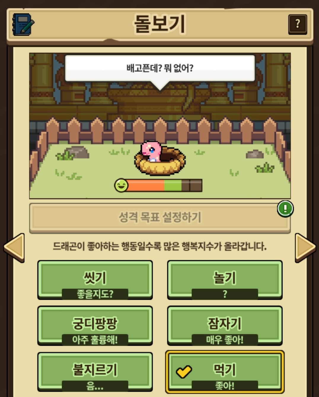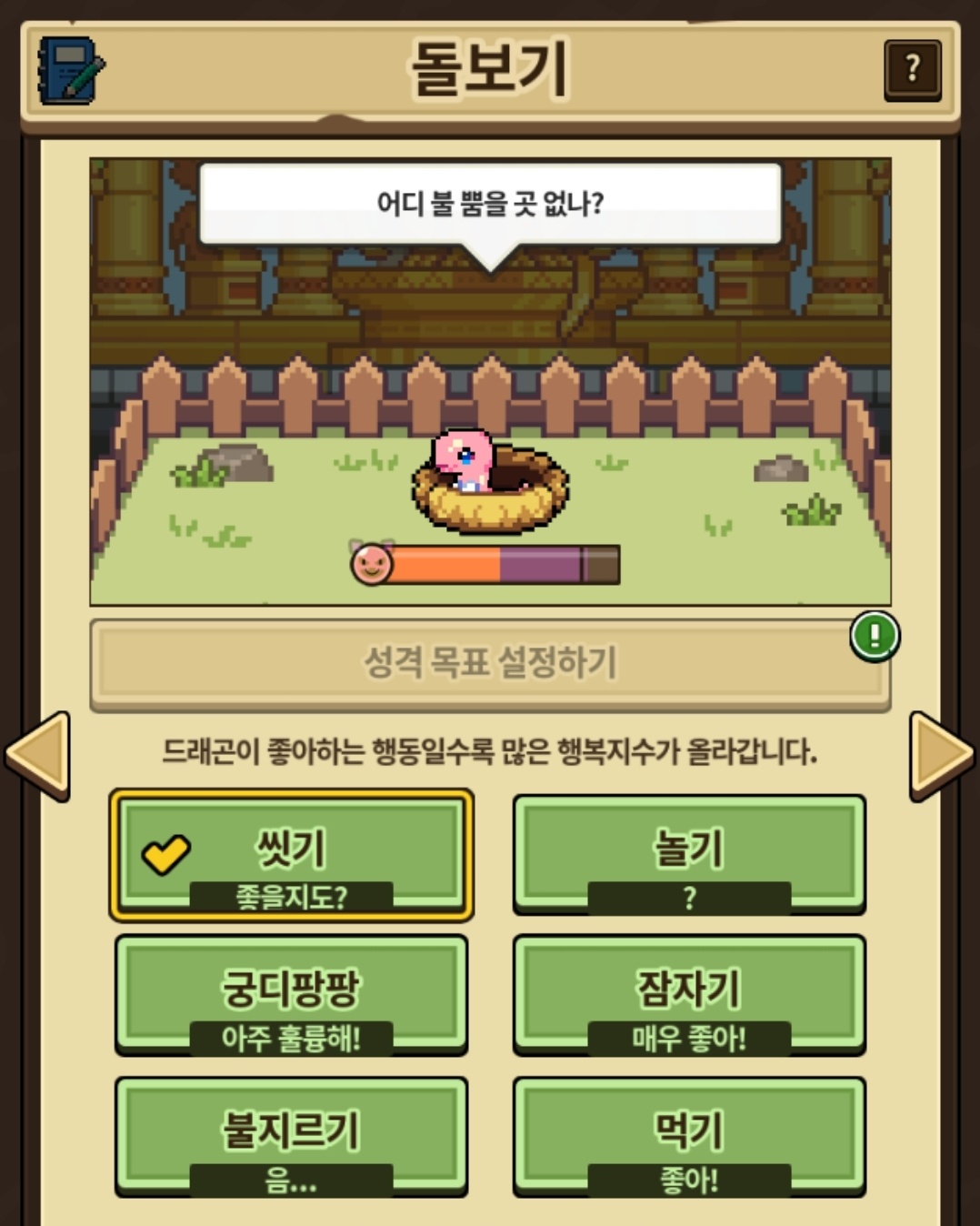 니티 돌보기 중 ‘좋을지도?’인 씻기가 ‘좋아’인 먹기보다 높은 현상이 있습니다. 표기 오류인듯 해 보이니 확인 부탁드립니다.
