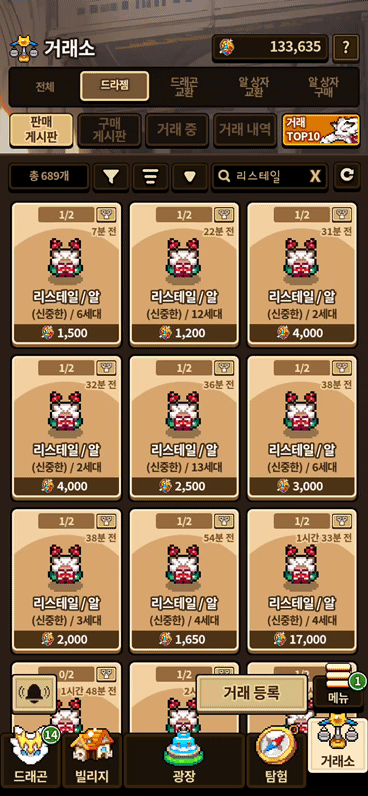 현재는 리스테일만 검색한채로 진행했으나, 드라젬 거래소 초기 화면에서도 해당됩니다.