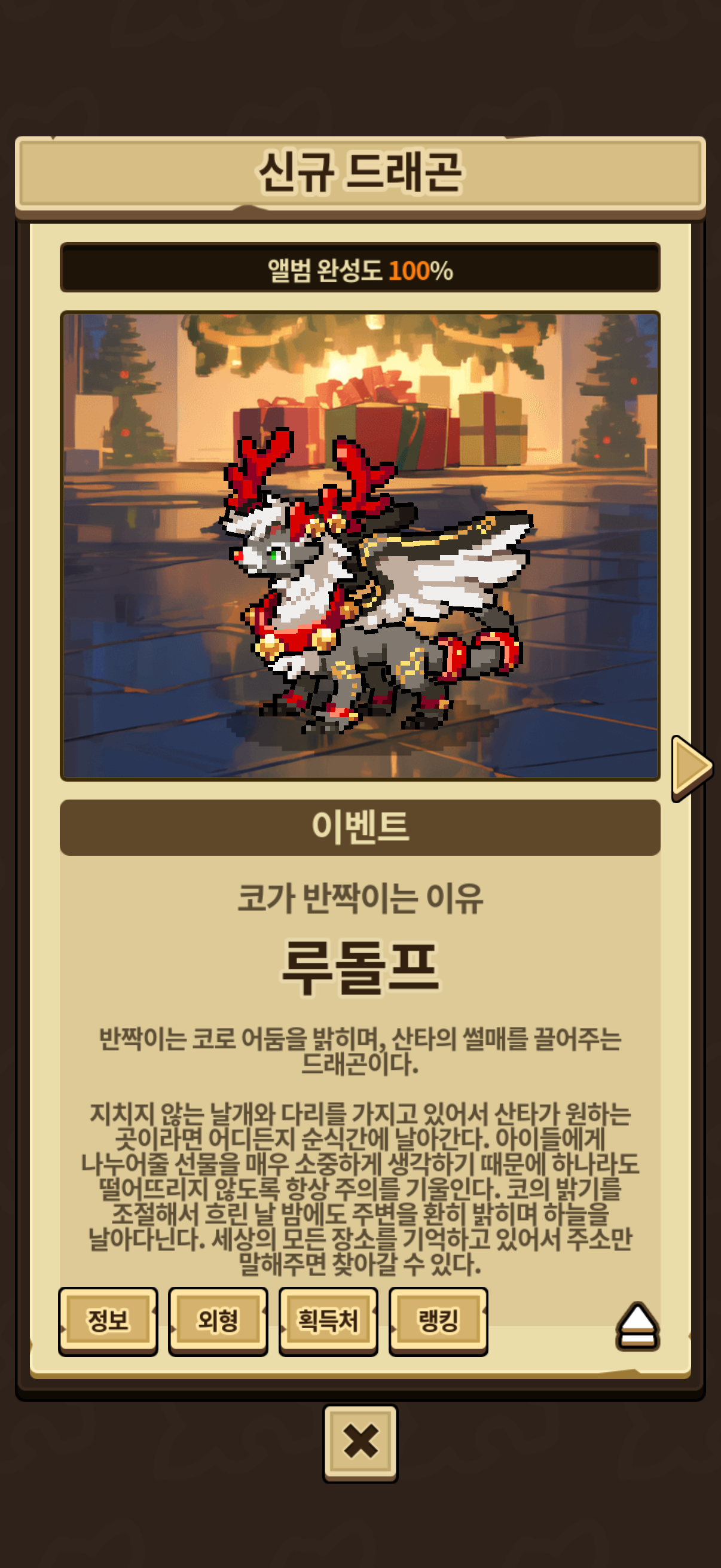 탈출 버튼으로 새로 고침, 완전 재접속까지 했는데도 반영이 안되네요. 만약 이거 버그로 문제가 생긴거라면 1000다이아, 2?만 드라젬 사용한 건 기분이 별로 좋진 않겠네요. 13?년만에 리메이크 된 루돌프라서 투자한건데;