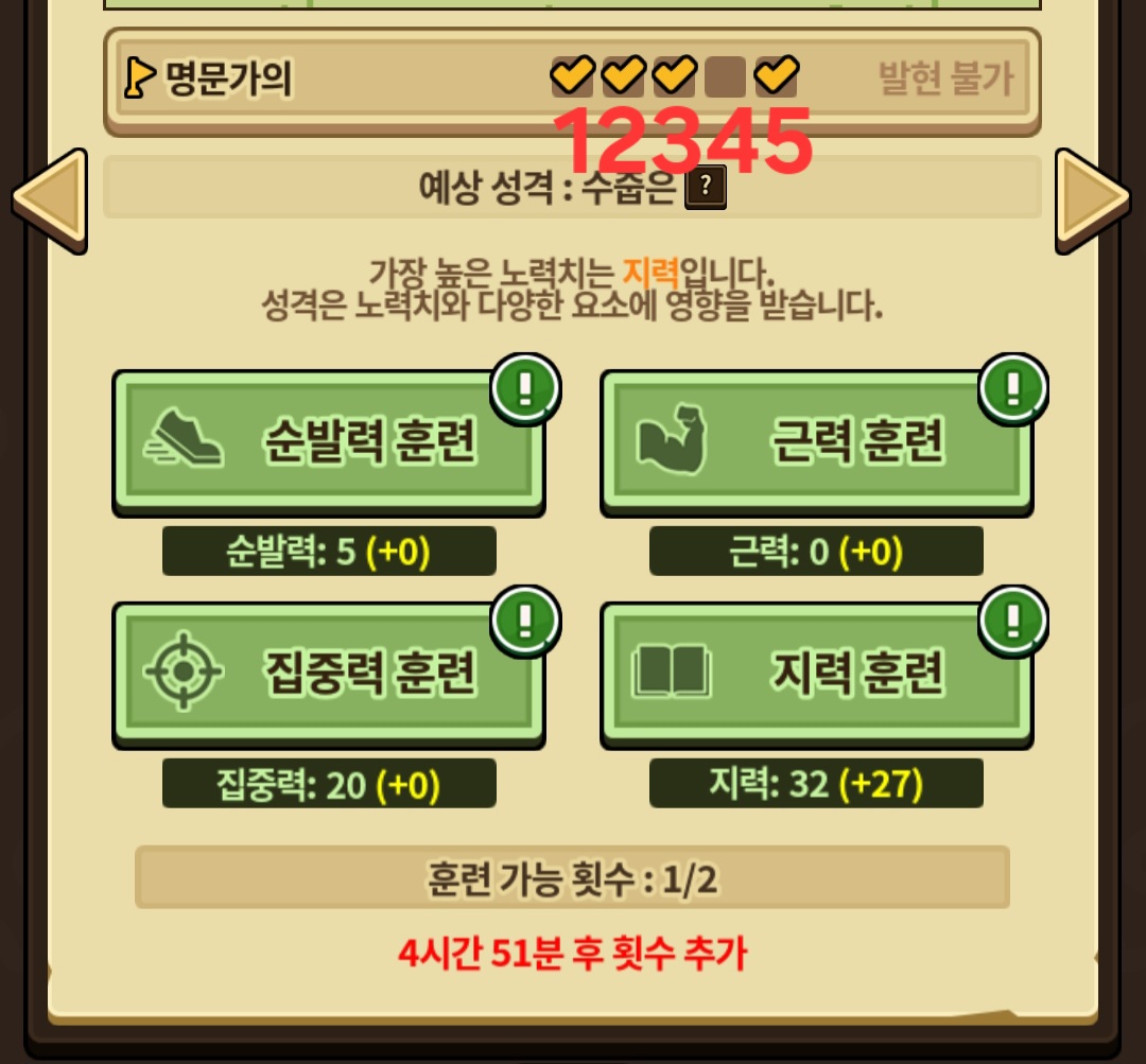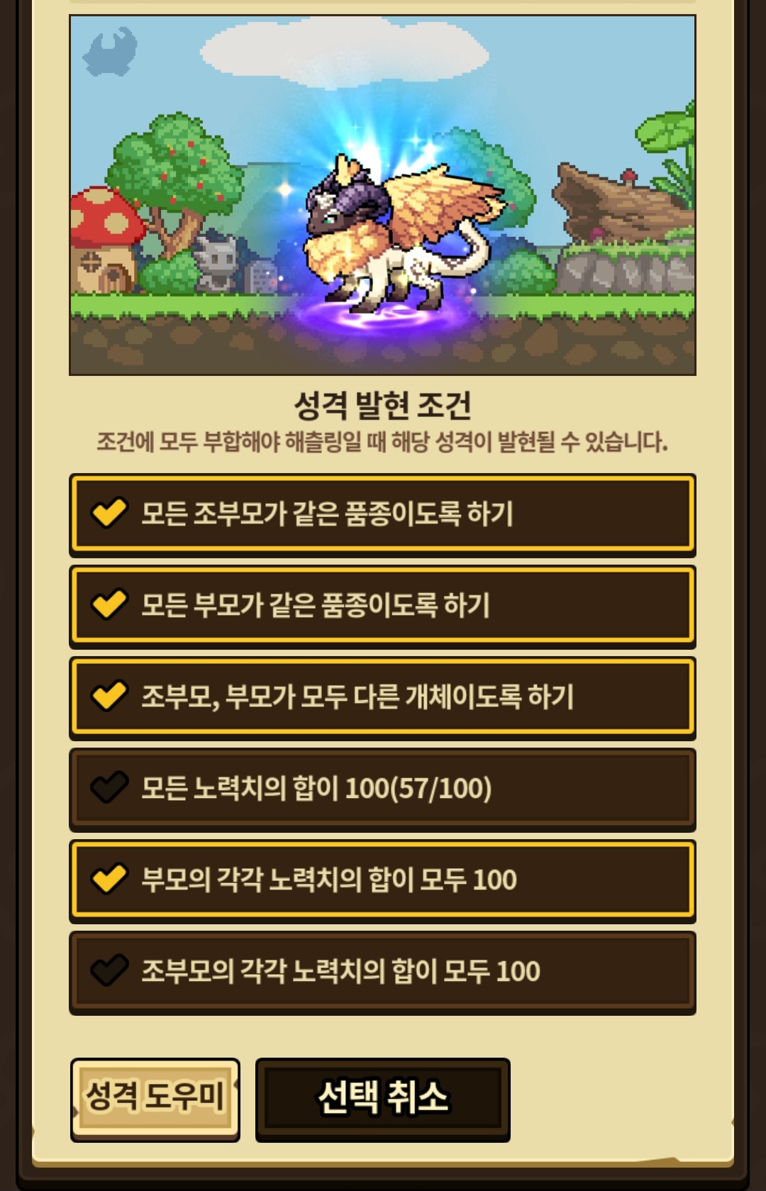 '명문가의' 성격은 조건이 6개라 체크박스가 6개가 표기되어야 하는데 오른쪽 사진에 나와있듯이 5개만 표기되고 있습니다