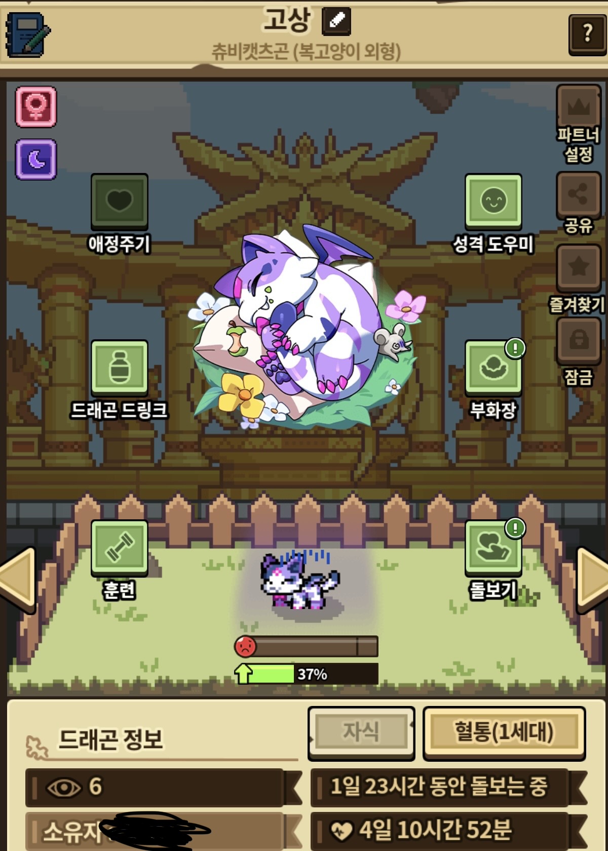 해치상태에서 어떤 돌봄도 하지 않고 슬픔상태를 유지하는데도 행복도 만땅인 용들과 비슷하게 성장합니다.