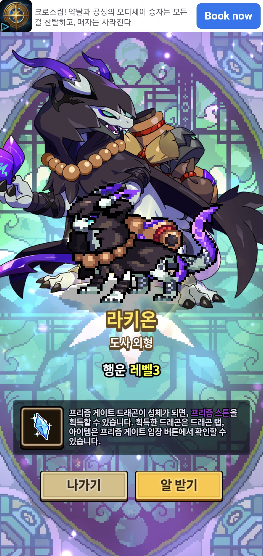 프리즘 라키온의 연출이 환술사 라키온의 연출임에도 도사 외형 라키온이 나왔습니다. 연속으로 두 번 라키온을 획득했으나 두 마리 전부 환술사 라키온 등장 연출이 나타났던 도사 외형 라키온입니다.