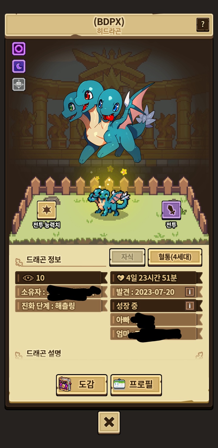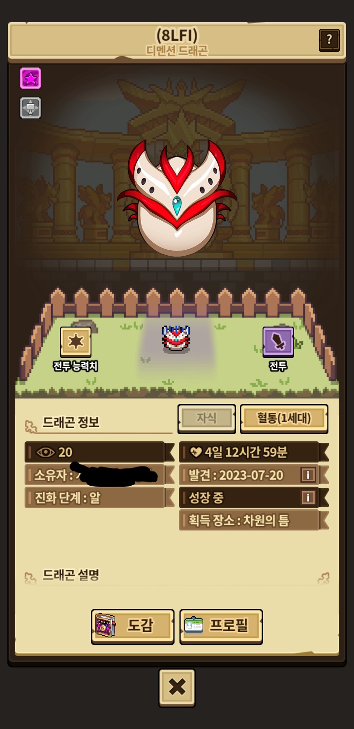 알이든 해치든 해츨이든 성체이든 거게에 올라온 드래곤이든 아니면 같은채널에 있는 드래곤이든 다 옆에 저런 전투화면이 뜹니다.. 누르면 별 반응은없고 버튼 누르는 효과음만 나요