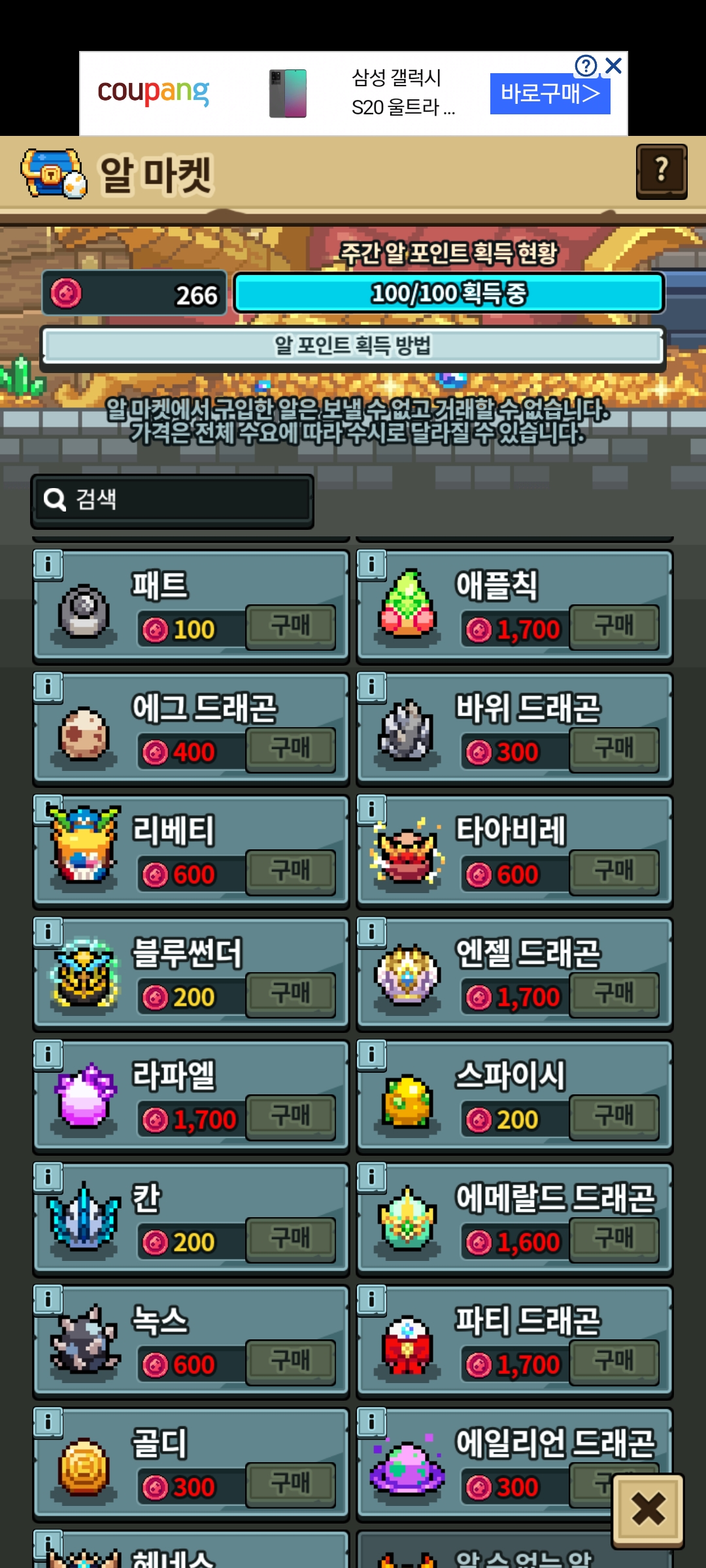 알 마켓에는 얻어 본 알들만 정보가 뜨는걸로 알고 있는데 가져본 적도 없는 엔젤드롸곤 알이 표시 되어있길래 오잉? 했슴다. 이런일이 일어날 경우가 뭐가 있을까…곰곰히 생각해보니 쿠즈마라 쥬롸관을 얻었던게 아마 버?그에 의해서 이렇게 표시된게 아닌가 싶네요.