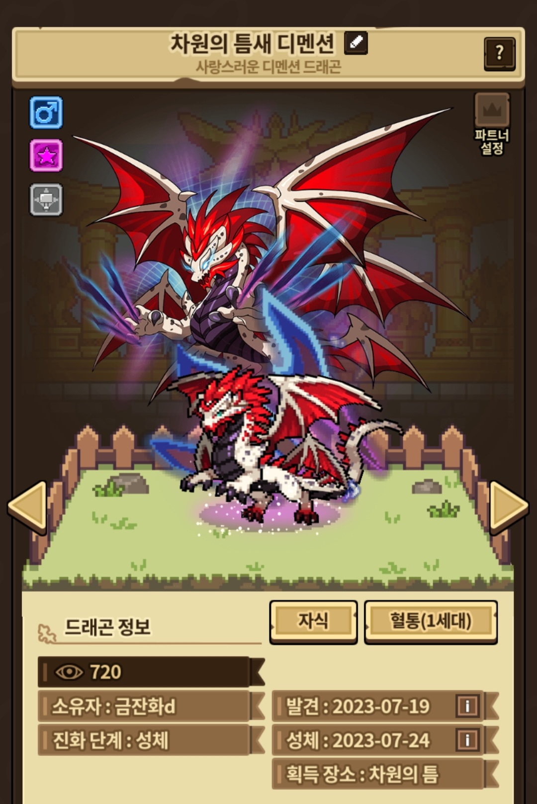 제가 현재 소유하고 있는 1세대 디멘션에게는 원래 사랑스러운 성격으로 키우려고 하다 조회수 200도 못채우고 해츨링으로 진화하여 훈련 버튼에서 차분한 성격으로 확정된 상태에서 그 당시 루네라가 있어서 차분한 말고 다른 성격을 원해 특수능력으로 바꾸려고 하였으나 바꿀수있는 성격이 없어 차분함밖에 없어서 아쉬운 마음으로 제 디멘션은 차분한 성격이 되었습니다 시간이 지나고 디멘션 1세대를 파트너로 오랜시간 데리고 다녔고 720 조회수로 늘게되었고 오늘 달빛보석이 업데이트되었고 디멘션 성격 바꿀수있을까? 하고 보석을 사용해 변경하였습니다만 지금 생각해보니 해츨링때 제 디멘션은 조회수 150정도였고 알부터 해치때까지의 조건을 바탕으로 성격이 결정되는 드래곤빌리지 컬렉션의 시스템상 무언가 이상한거같다는 생각이 듭니다 아마도 제 추측은 알 해치때까지의 조건만으로 달빛보석을 사용할 드래곤의 성격을 바꿀수있어야 하지만 어째서인지 해츨링상태와 성체상태에서까지의 조건까지 포함하여 이런 버그가 발생하지 않았나 추측합니다 다른 사이트에서도 성체 드래곤 버리기 실패했는데 원래 성격에서 소극적인 성격으로 바뀌었다고 들었습니다 (알부터 해치때 버려야 소극적인 성격 바뀌는 걸로알고있고 이미 성격이 결정된 성체가 바뀌는건 이상한것같습니다) 아 근데 제 디멘션 어떡하죠?