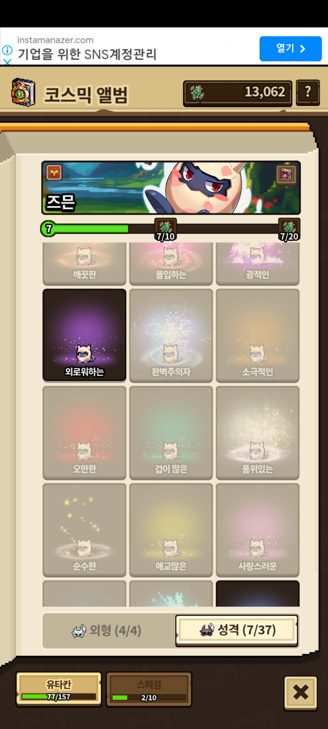 성격 얻었는데 코믹스 성격이 안열려있음