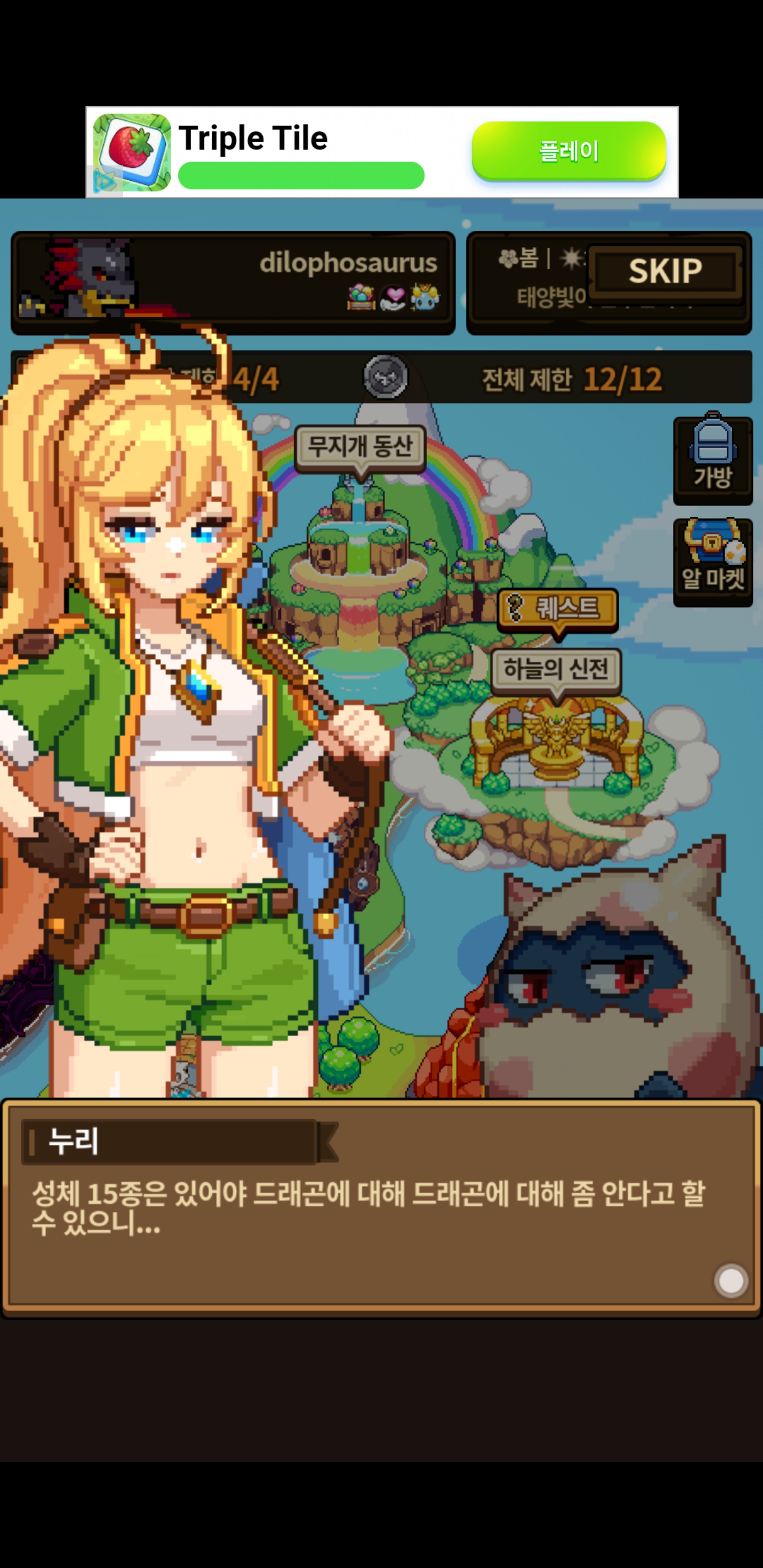 성체 15마리가 없을 때 퀘스트 버튼을 누르면 나오는 대화씬입니다