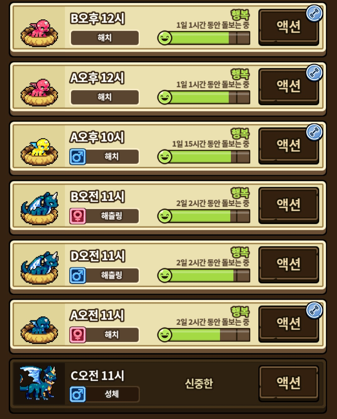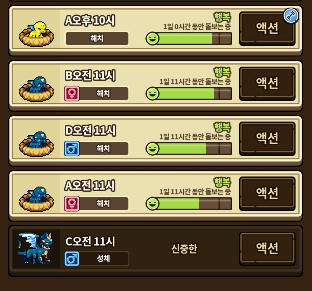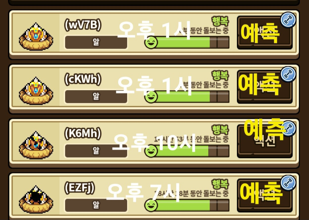 그렇게 획득 시간에 따라 표를 이용해 색을 예측한 결과 전부 노란색으로 나왔고, 실제로 오후 7시 획득한 식스레그혼은 노란색으로 부화했습니다