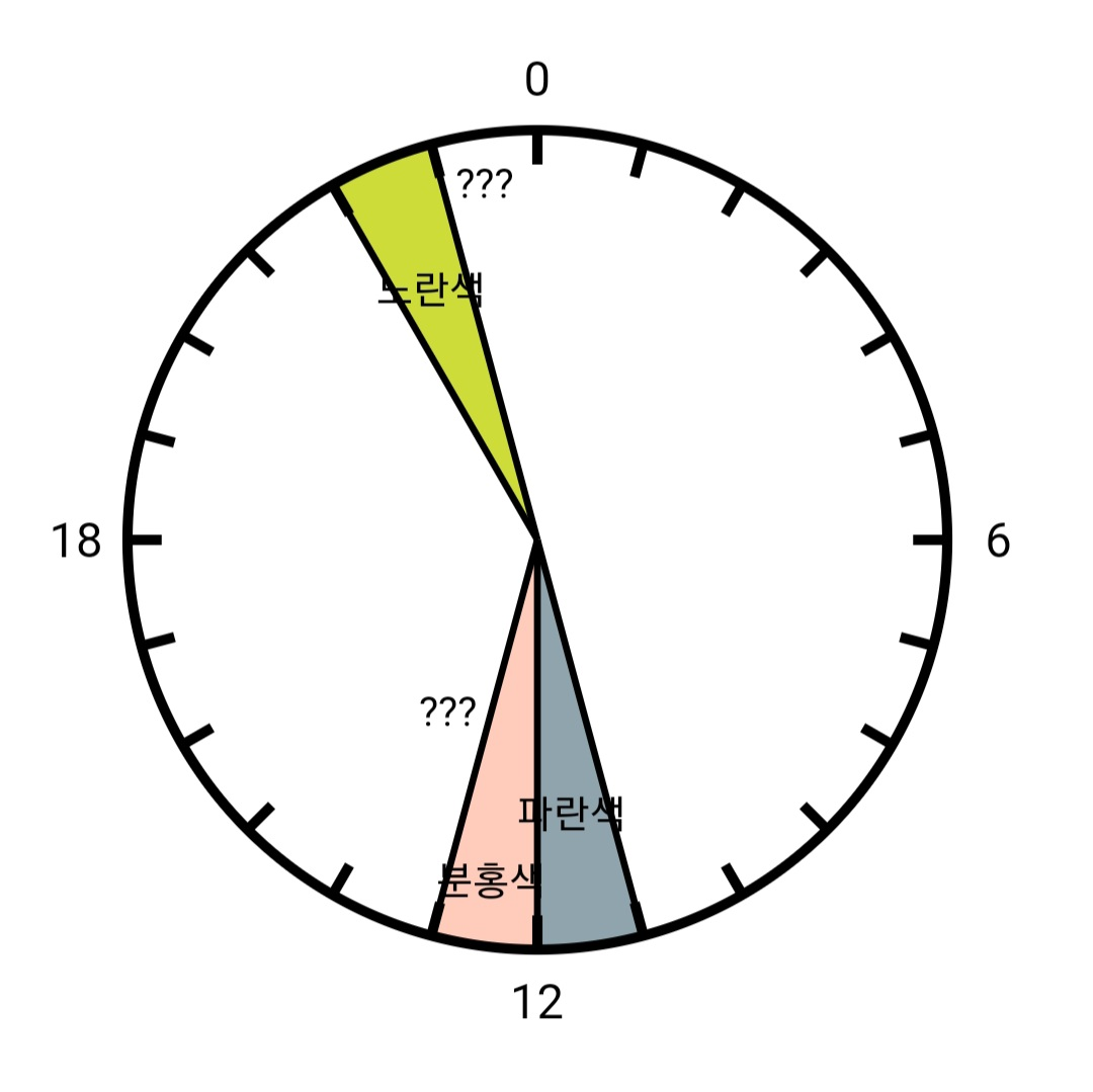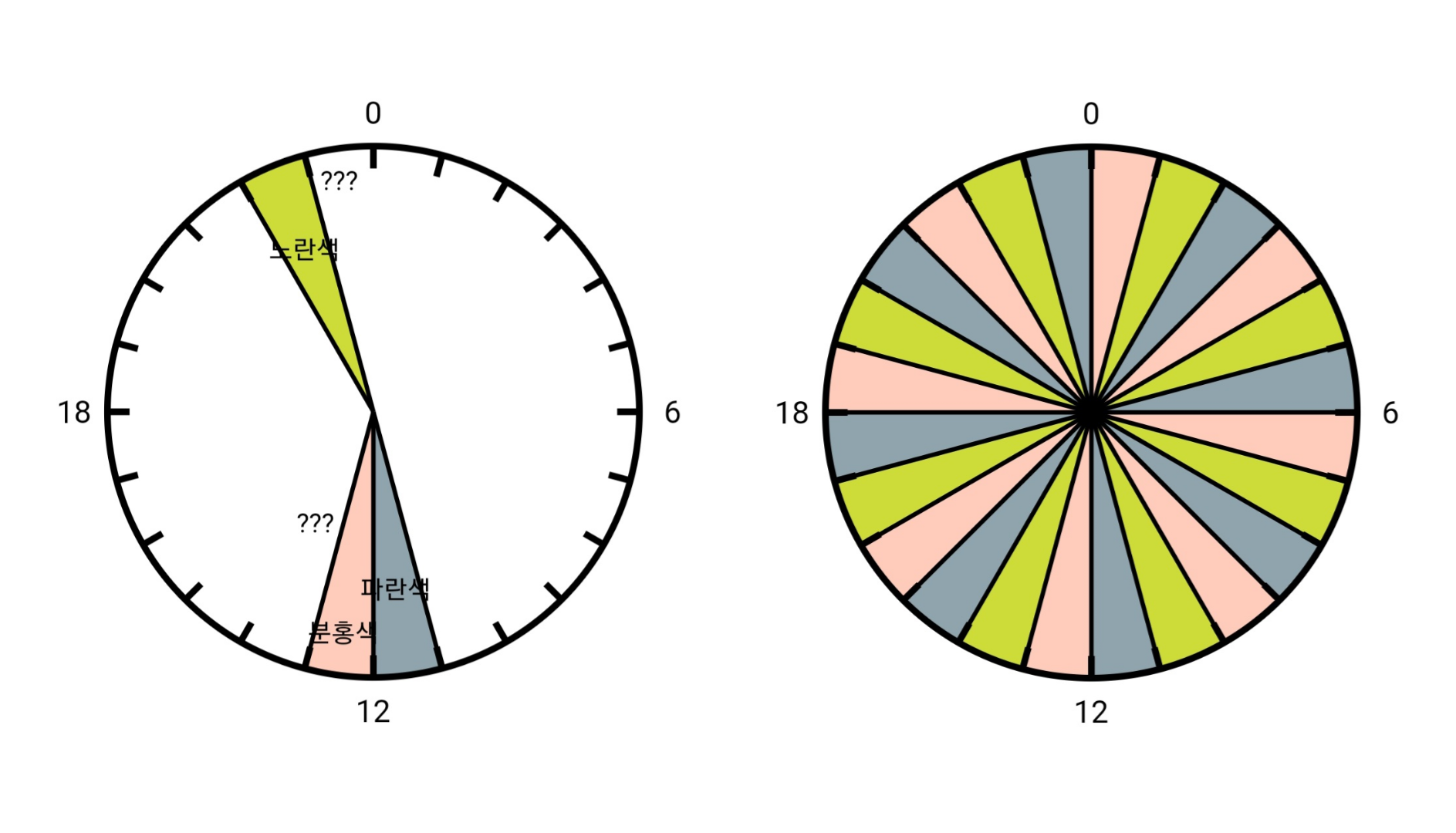 여기서 색이 1시간 단위로 분홍-노랑-파랑 순으로 바뀐다 가정하고 표를 그려 맞춰보면