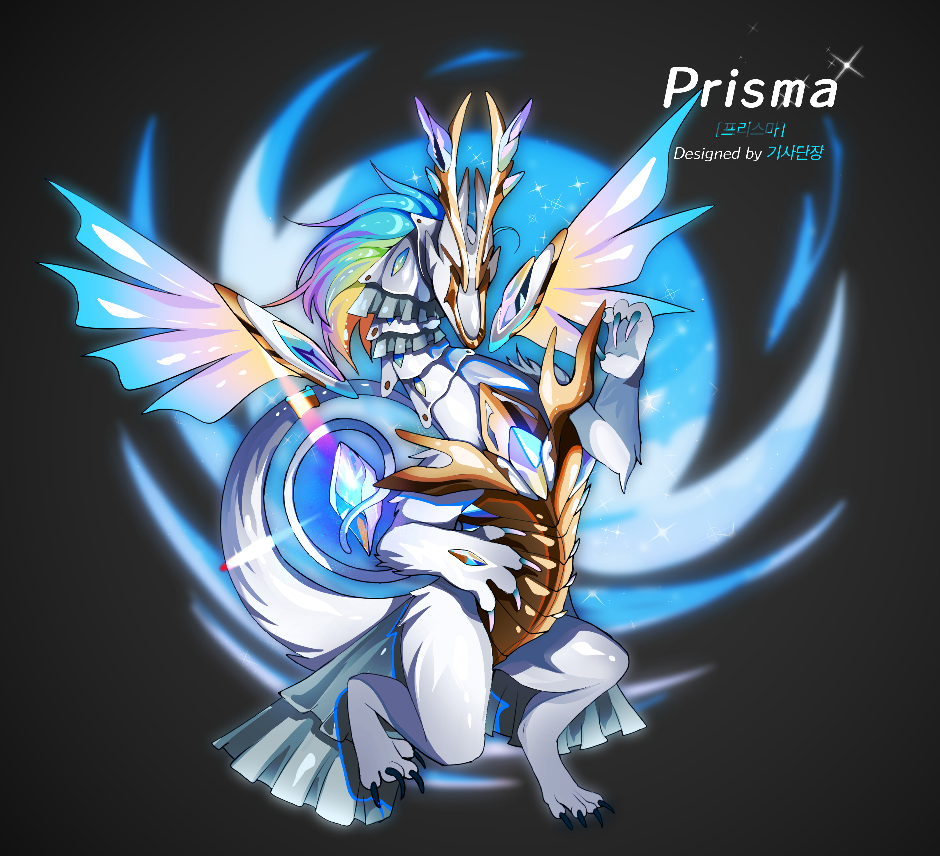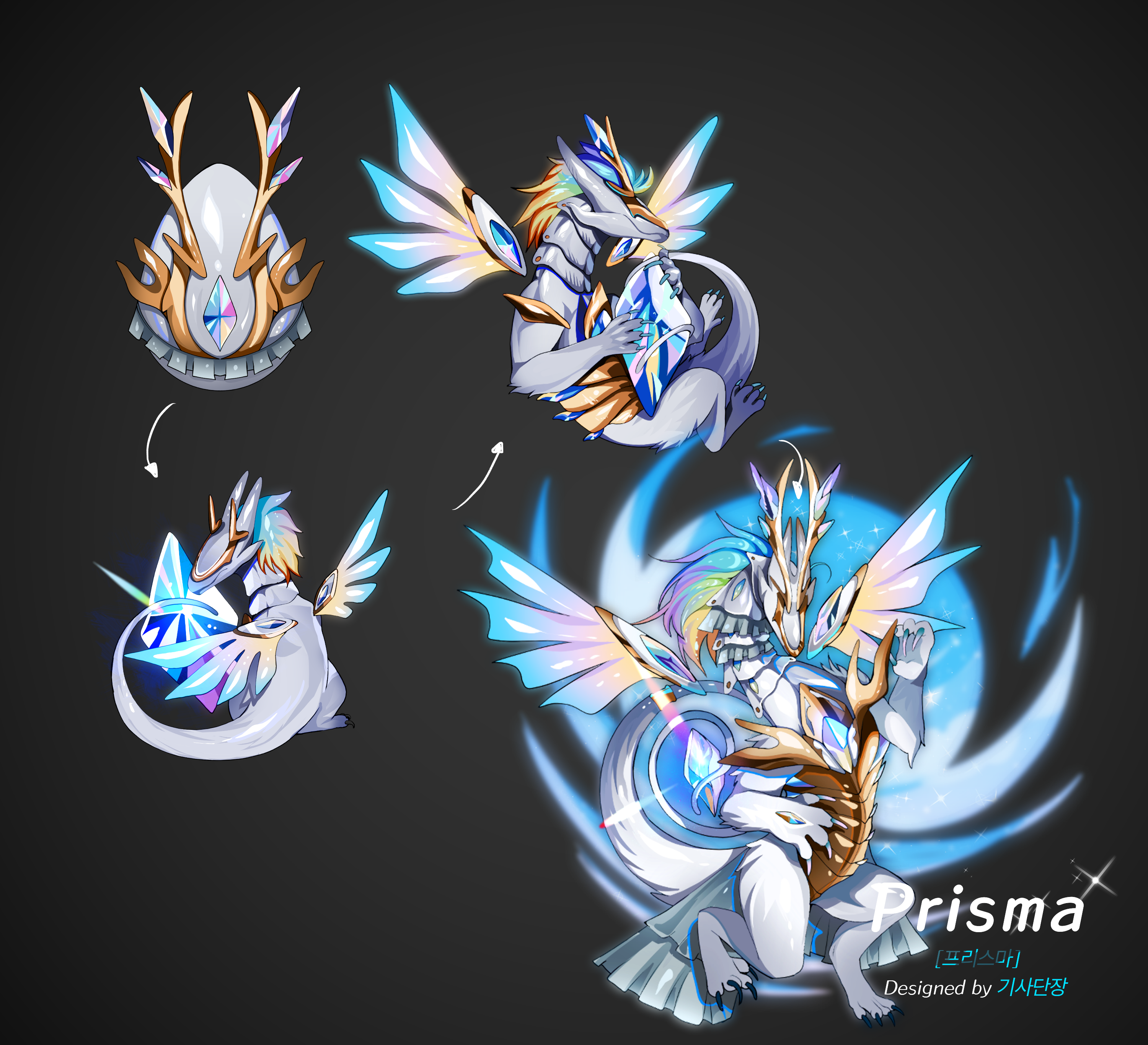 원래는 순백색의 아무 색이 없는 드래곤이지만 빛이 보석에 닿으면 프리스마 또한 색을 되찾는다.