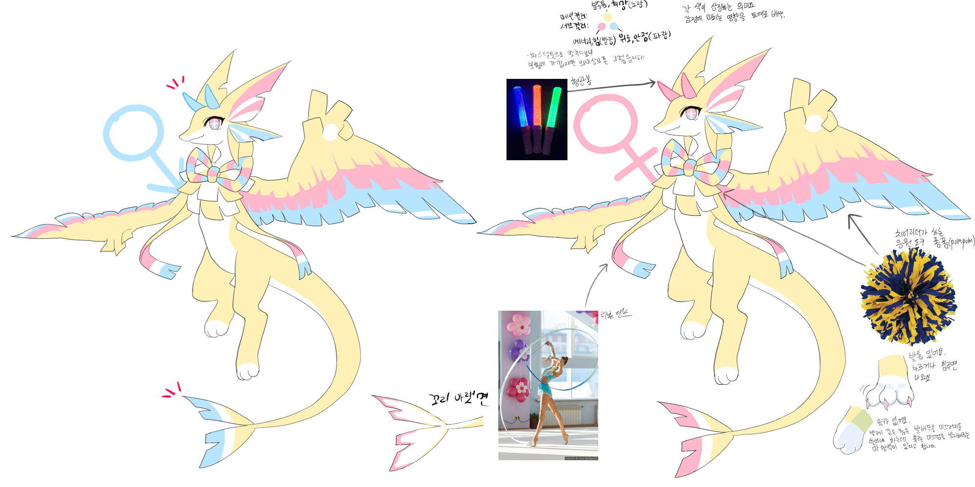 성체 일러 수정 전에 만든거라 성체 일러랑 포즈나 눈매 등이 다릅니다만, 눈은 위가 디폴트 입니다. 에너지 만땅으로 크게 뜬 눈... 성체 일러에선 자신이 응원해주고 난 뒤 힘과 희망을 되찾는 이들을 바라보며 뿌듯하게 웃는 모습을 담고 싶었기에 그렇게 그리게 되었네요.