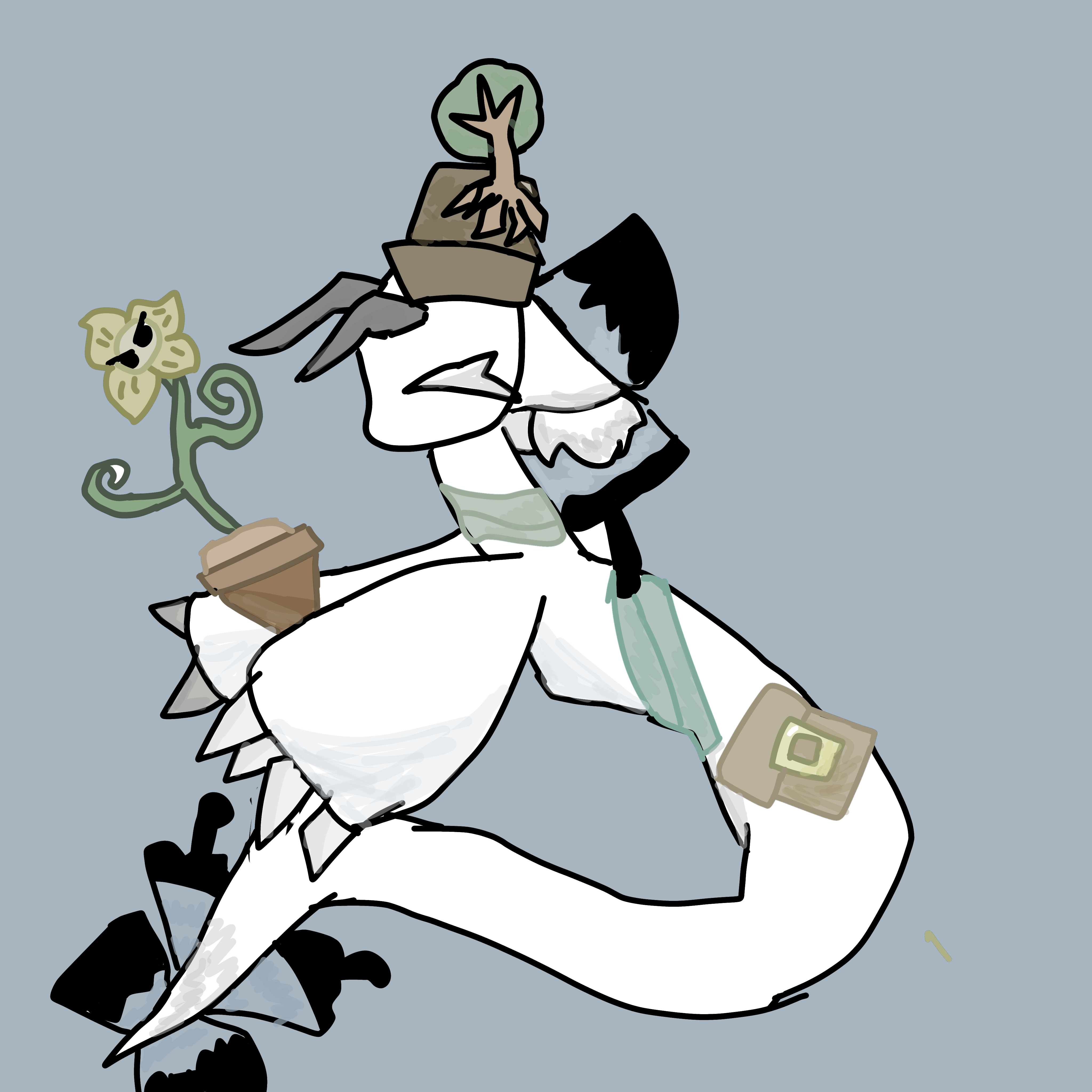 꼬리에 달린 나비날개로 꽃위에 앉아 상태를확인한다. 머리엔 화분을 쓰고 있다. 보통 허리에 있는 가방안엔 식물과 관련된 물건들이 많다. 해치,해츨땐 눈을 뜨고 있지만