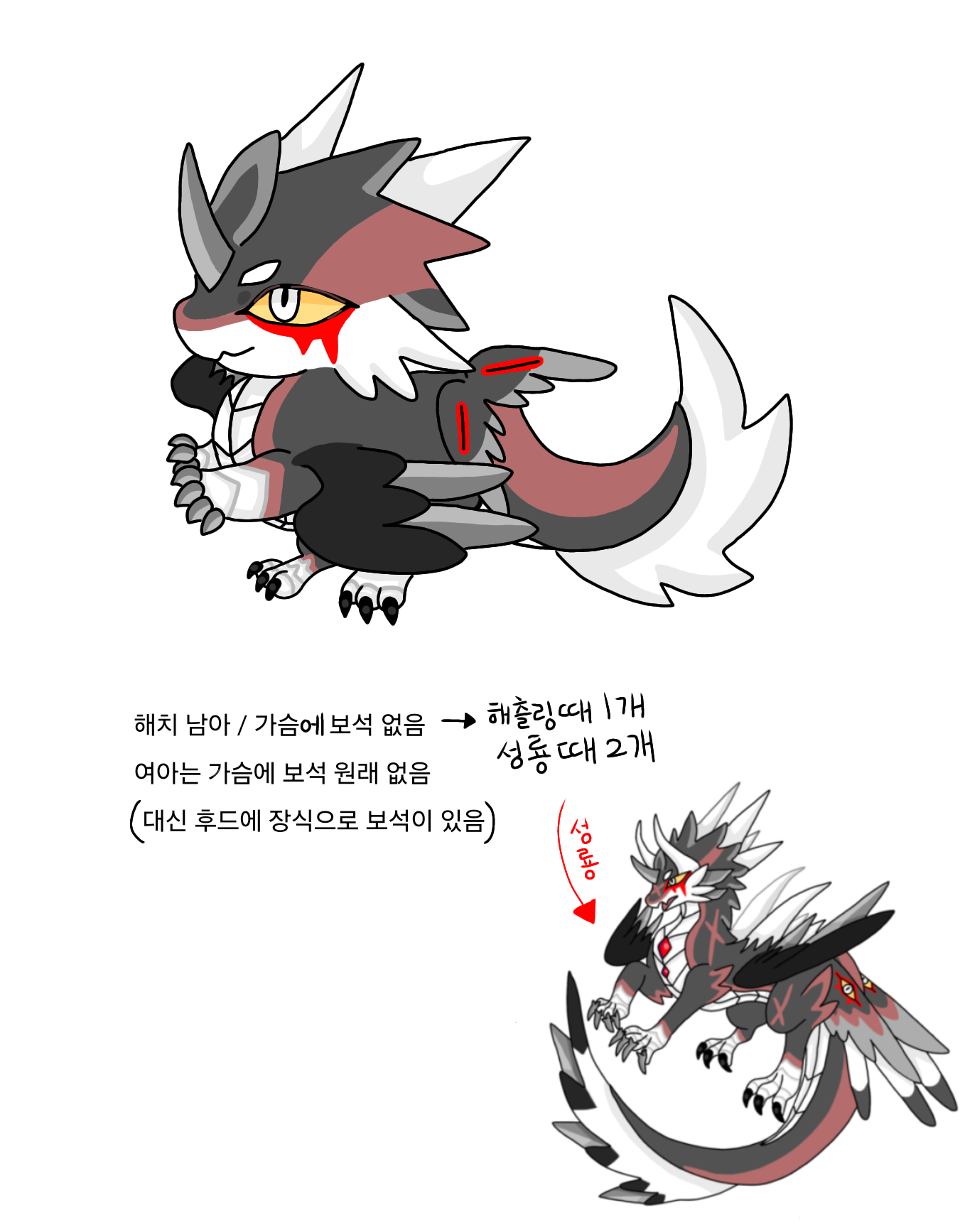 - ! 수컷개체는 해치 땐 가슴에 붉은색 보석이 없다.