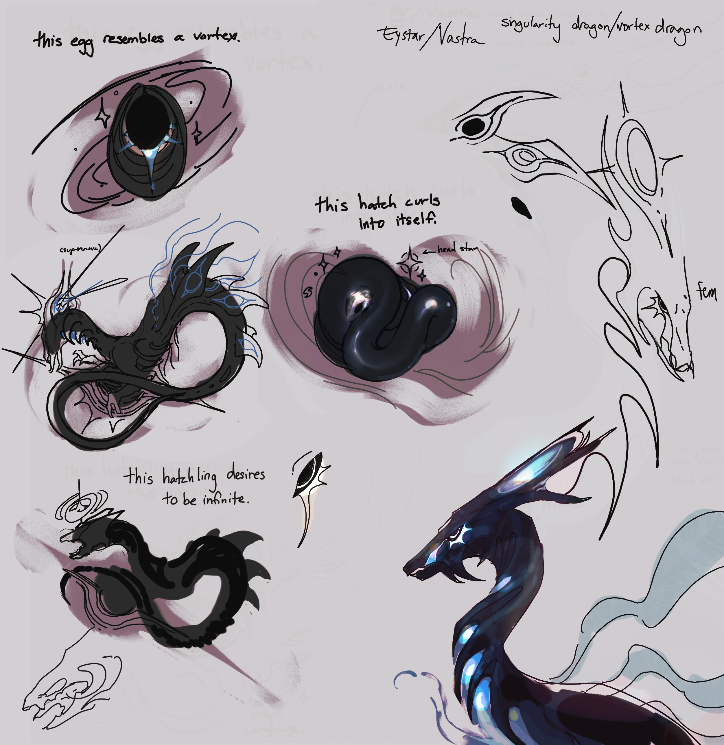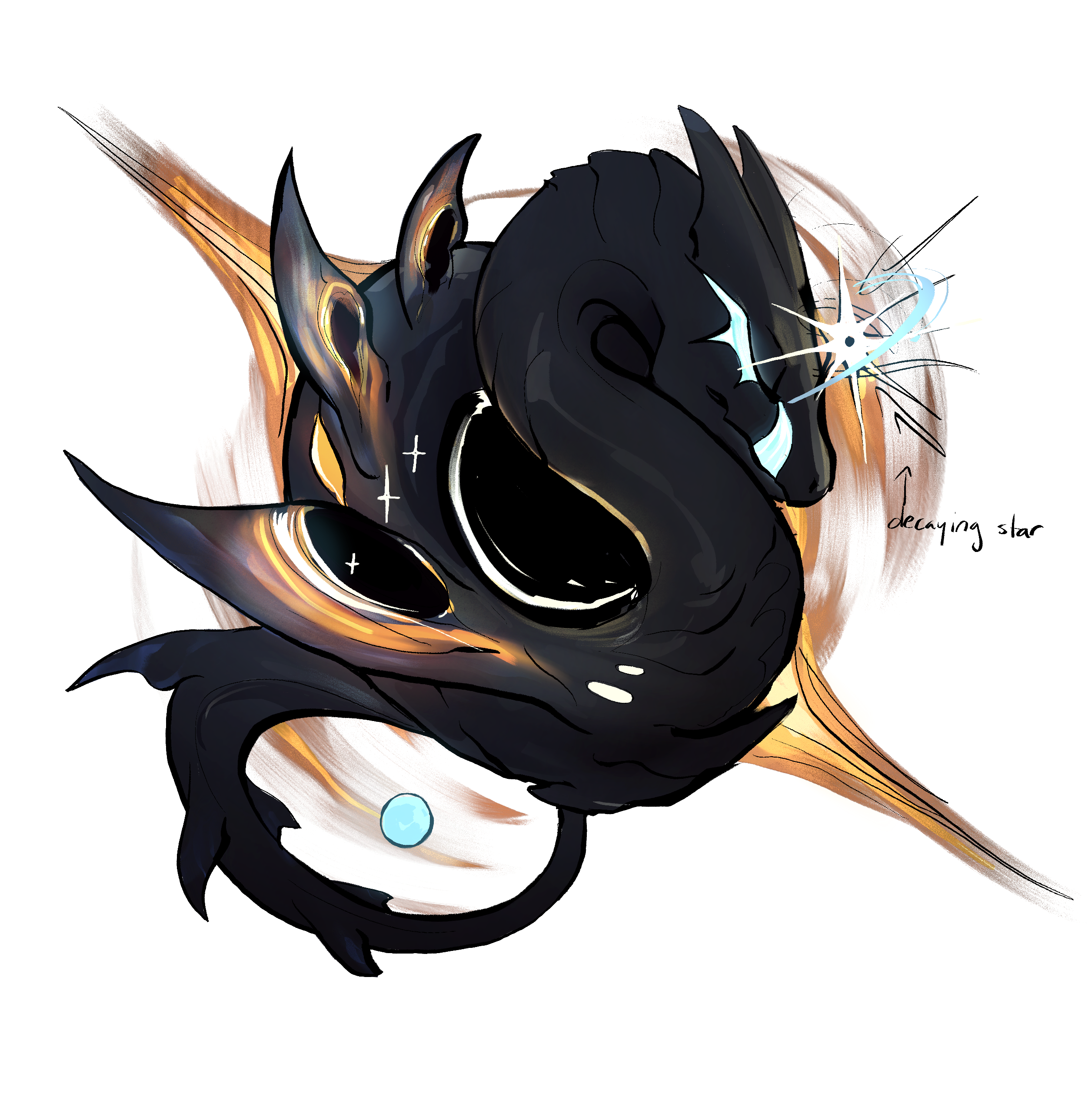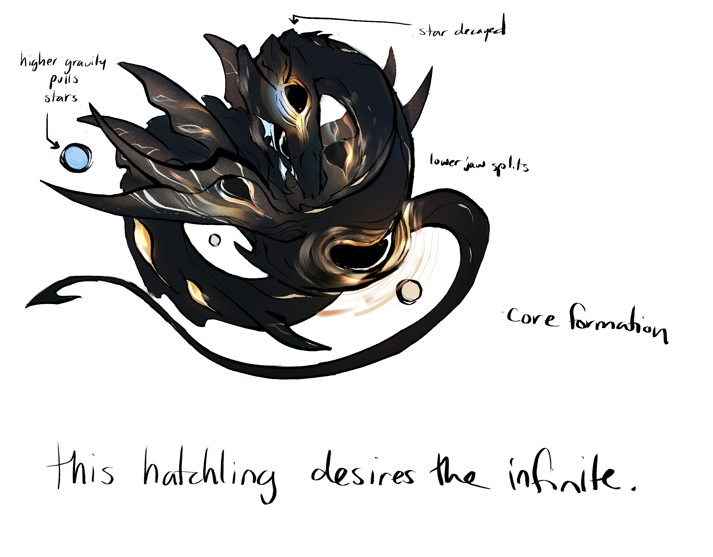 The gravitational anomaly has developed further, and so has the dragon cradling it. Its fins have grown large enough to propel it through space, and its jaw has opened and split to allow faster consumption of stellar material. The coronal star has evolved to a black hole which stores the dragon's memories and observations. The core singularity is large enough to pull even larger objects towards the dragon, amplifying its feeding abilities, and stark eyes pierce the endless black. Some handlers are unnerved by its unblinking stare.