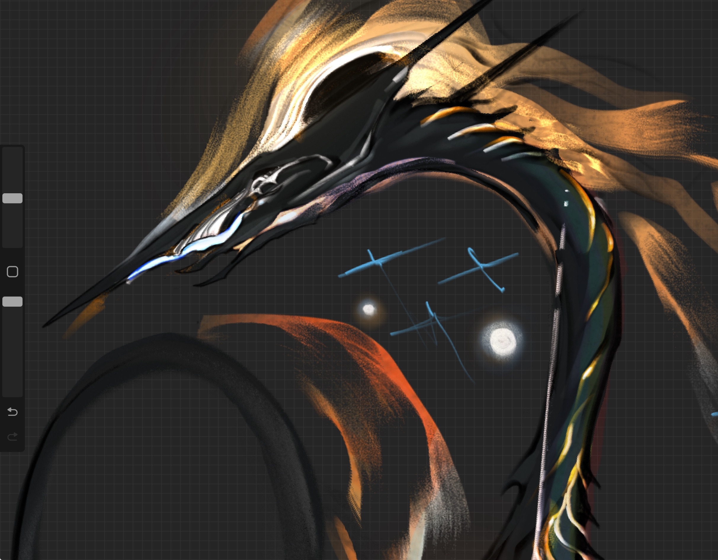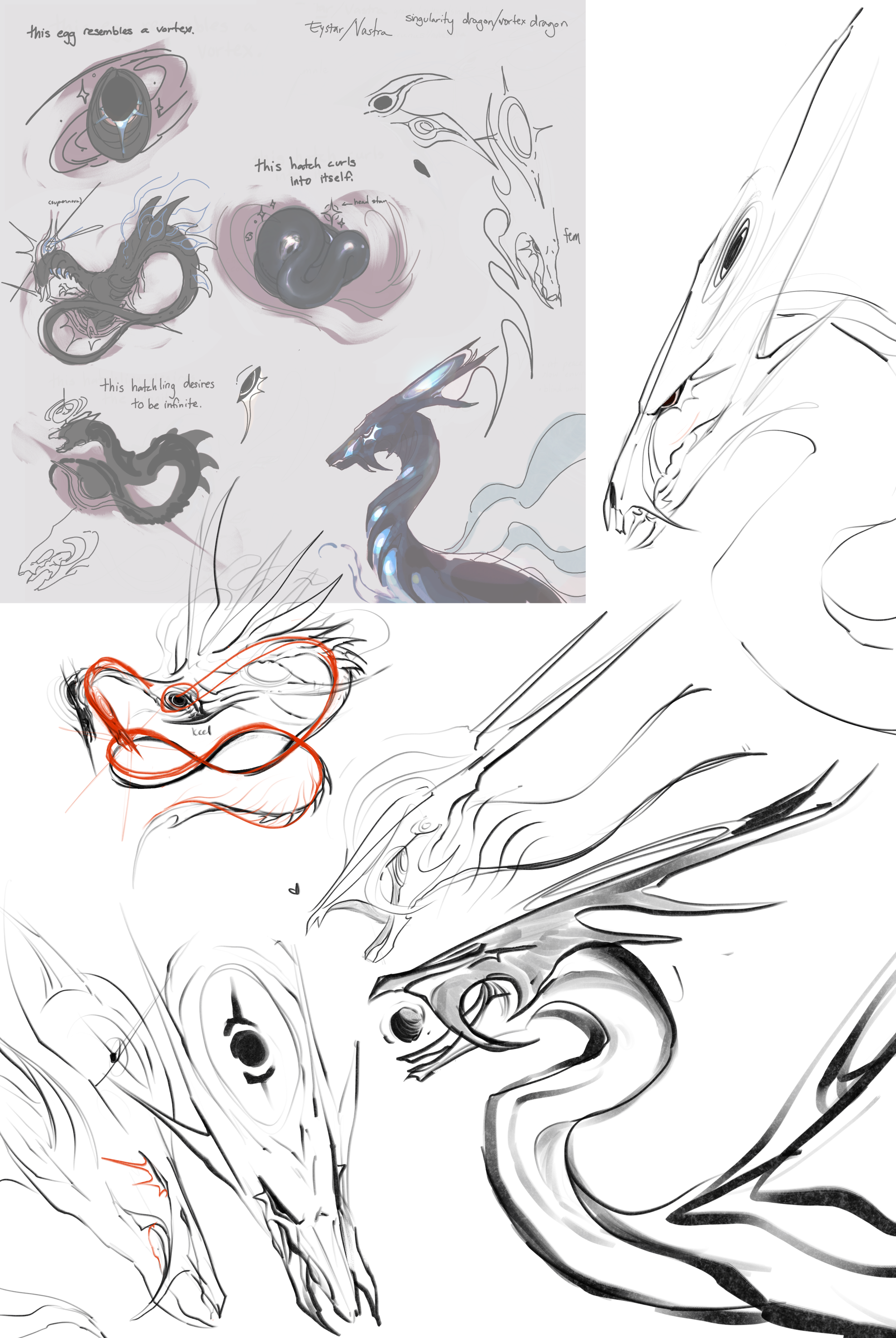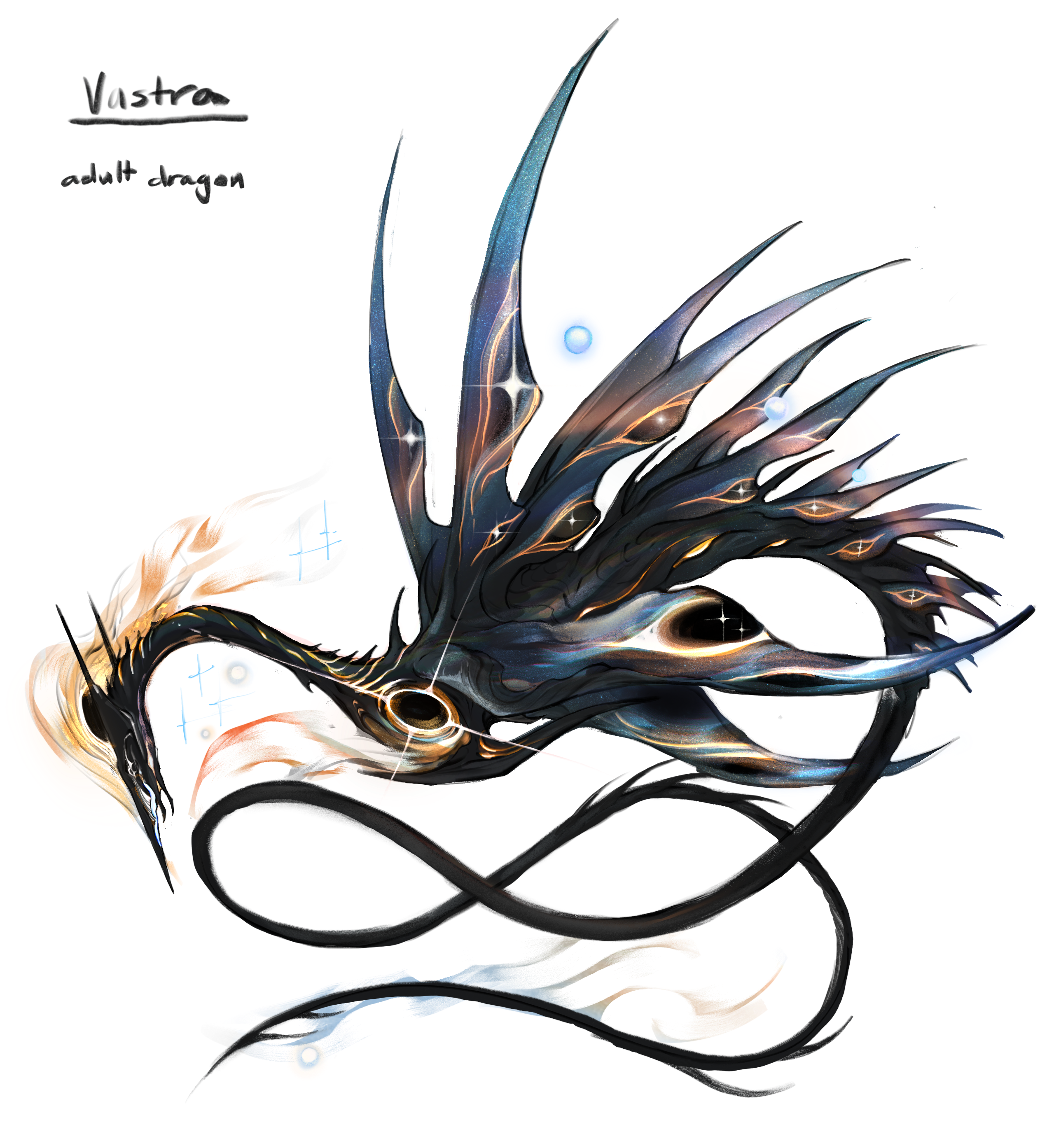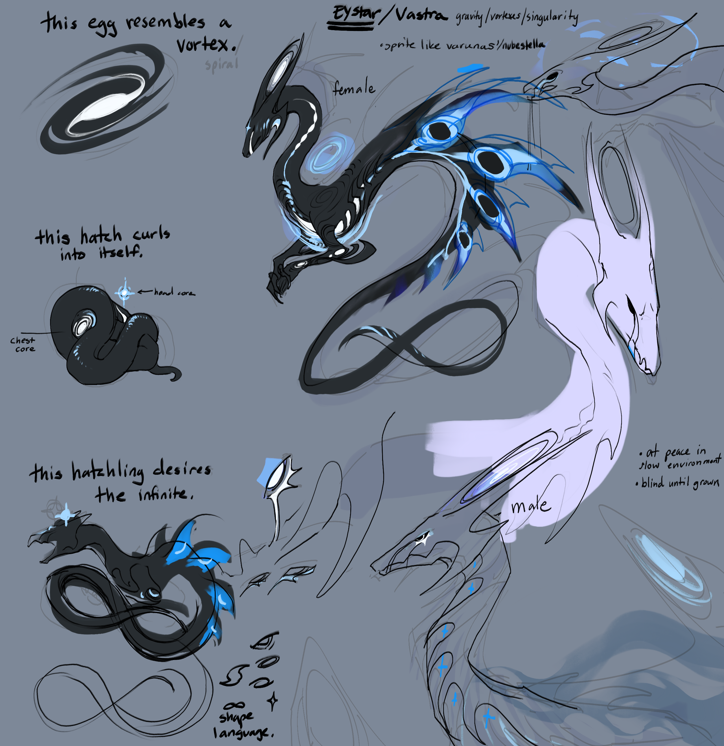 The gravitational anomaly has developed further, and so has the dragon cradling it. Its fins have grown large enough to propel it through space, and its jaw has opened and split to allow faster consumption of stellar material. The coronal star has evolved to a black hole which stores the dragon's memories and observations. The core singularity is large enough to pull even larger objects towards the dragon, amplifying its feeding abilities, and stark eyes pierce the endless black. Some handlers are unnerved by its unblinking stare.
