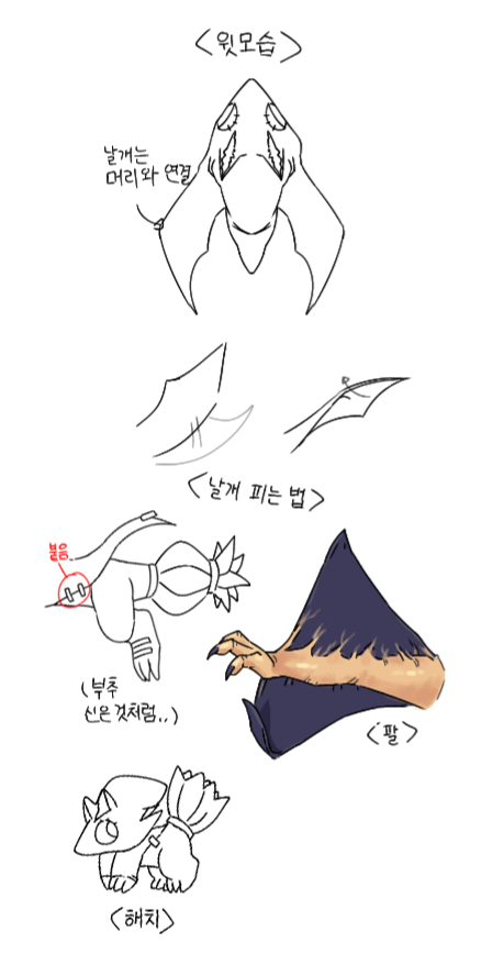 성장하면서 박쥐날개 같은 날개가 형성되었다. 하지만 날개로 비행하는 것이 아니고 몸 자체를 띄울 수 있다. 특이하게도 날개는 머리에서 유래되어있다. 날 때는 몸에 힘 뺀 듯 팔다리를 아래로 떨구어 난다.