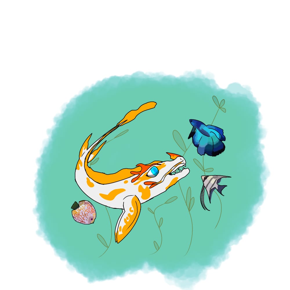 문명에서 멀리 떨어진 높은 곳의 호수 바닥에서 발견됨, 이들의 지느러미와 반점은 종종 해양 생물의 주의를 끌며, 특히 호기심 많은 눈으로 주위를 맴도는 작은 잉어의 주의를 끈다.