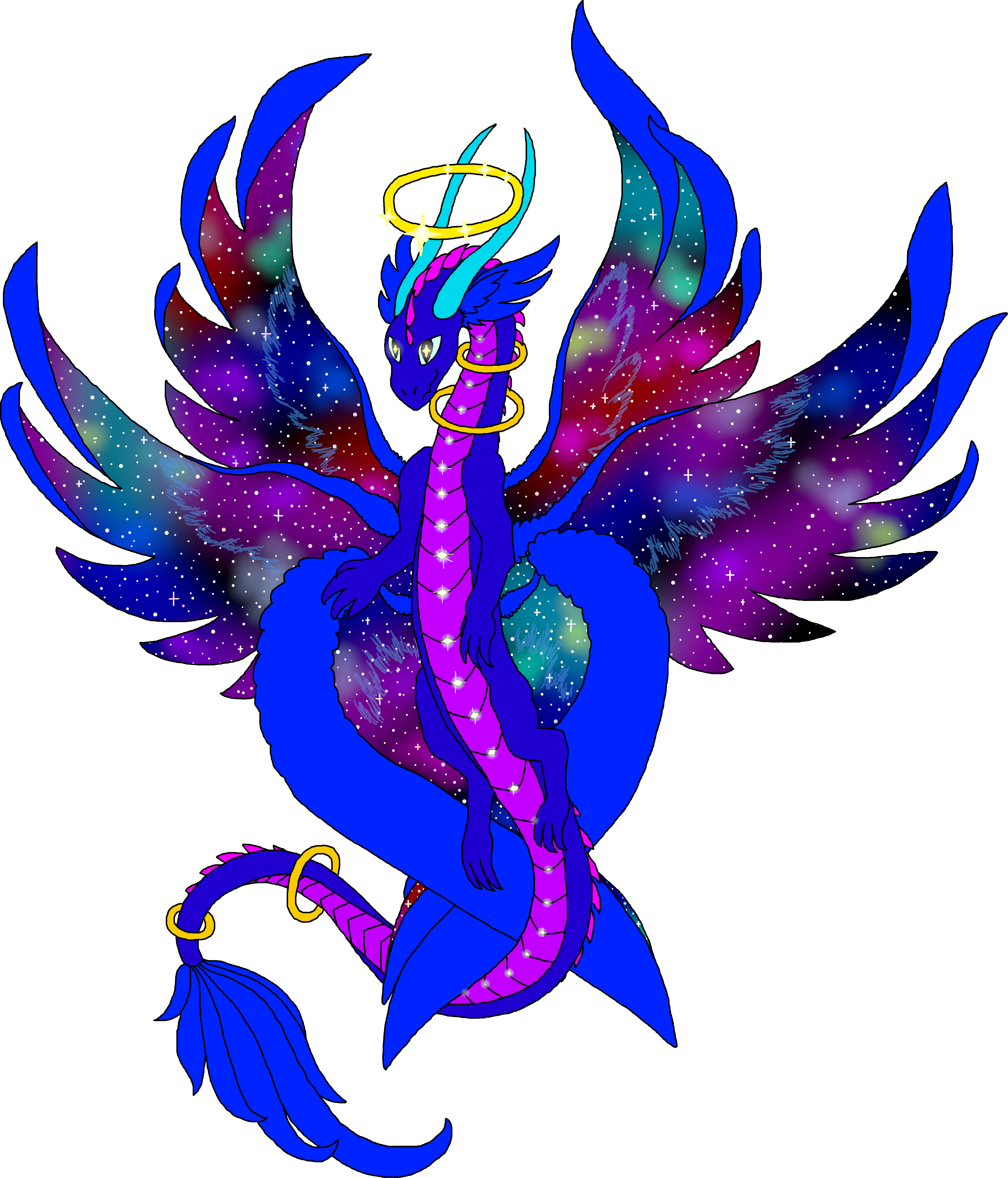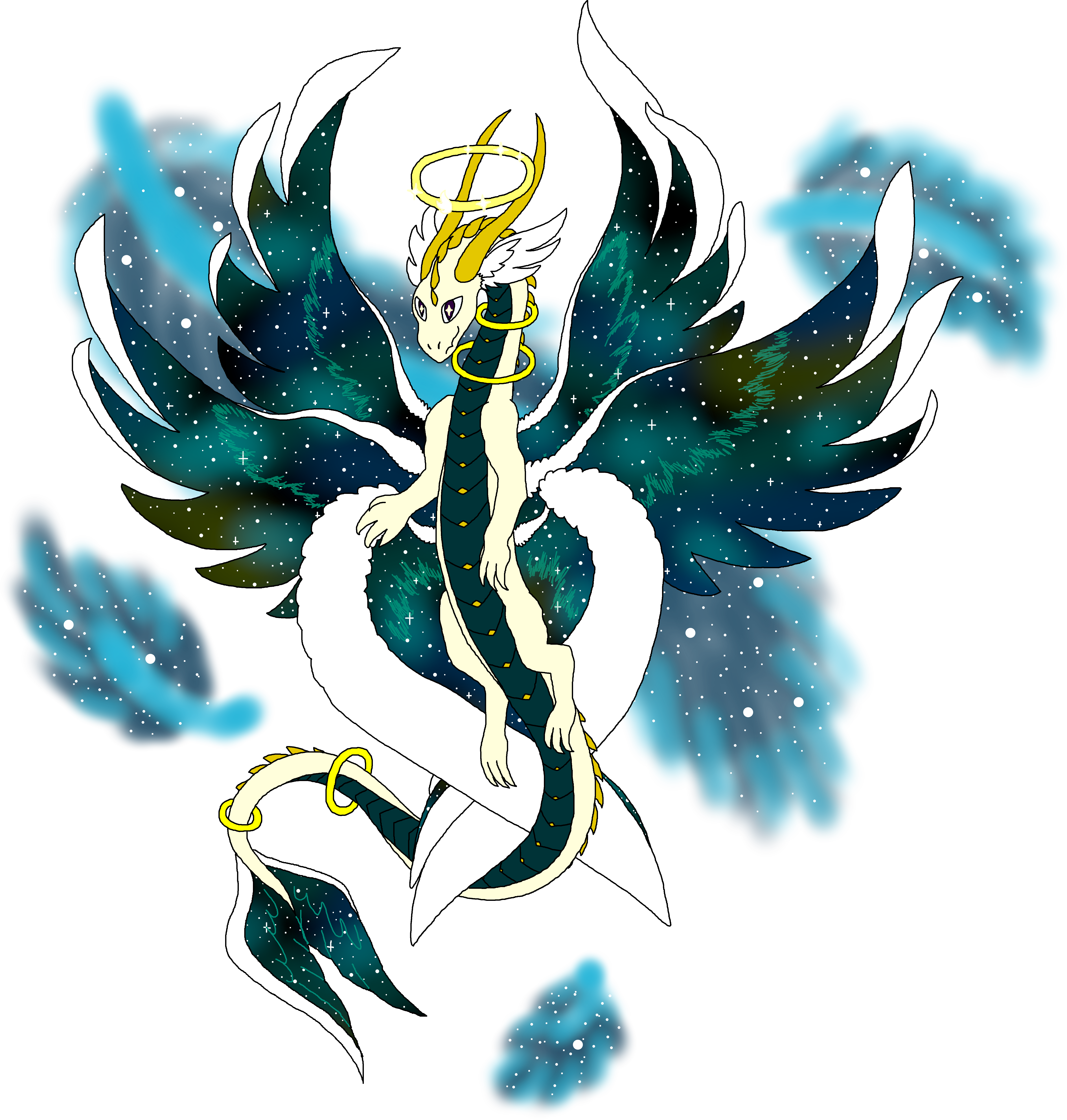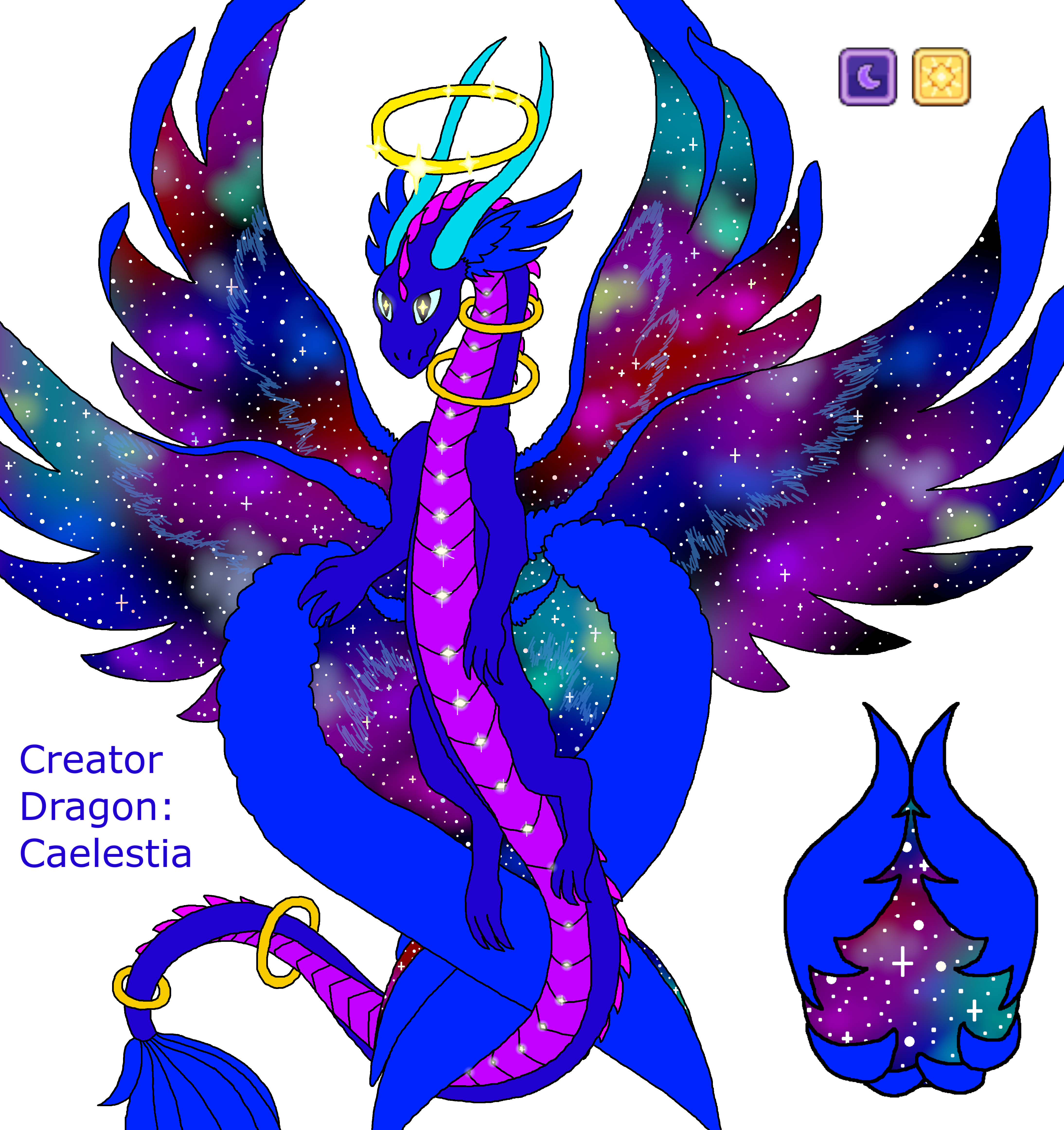 Adult: Its halo glows with sparkling stars that represent the dragon’s power. Floating rings circle its neck and tail without regard to gravity, showing its connection to space. Caelestia’s wings contain a unique galaxy of stars and space, and its divinity is apparent in its angelic feathers. It calls the whole universe its home, and travels to many worlds to bring that wonder and glory to others.