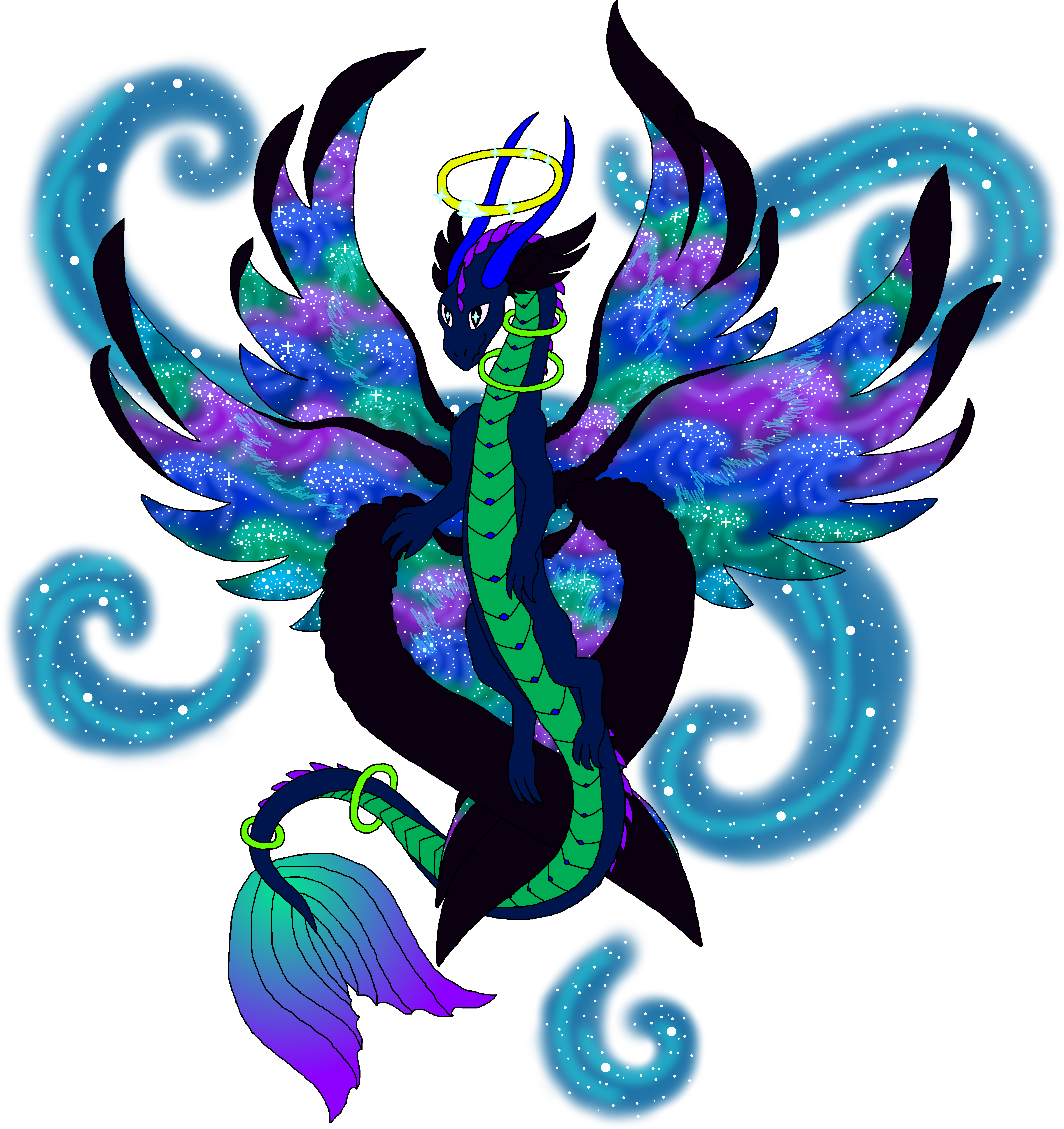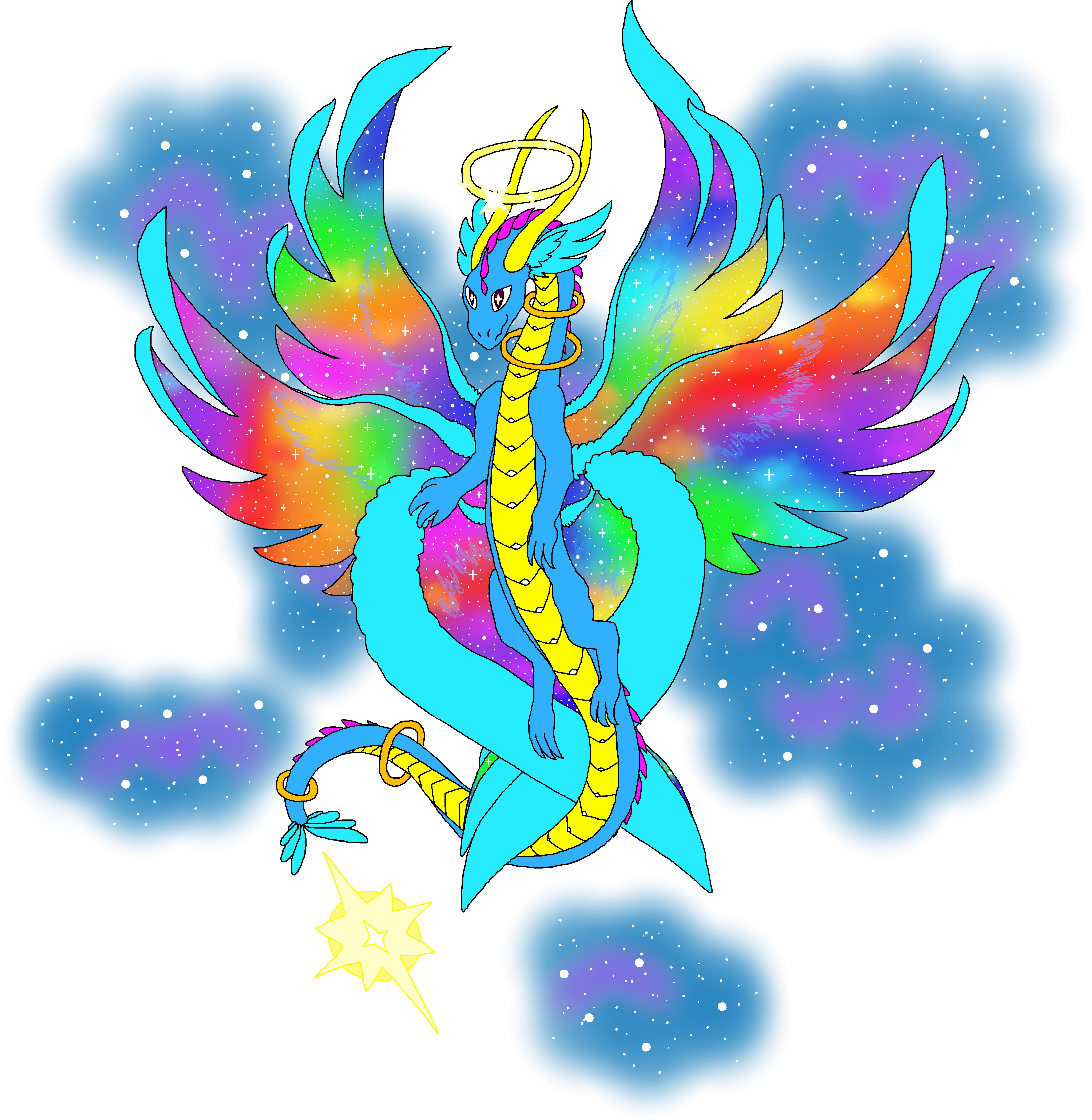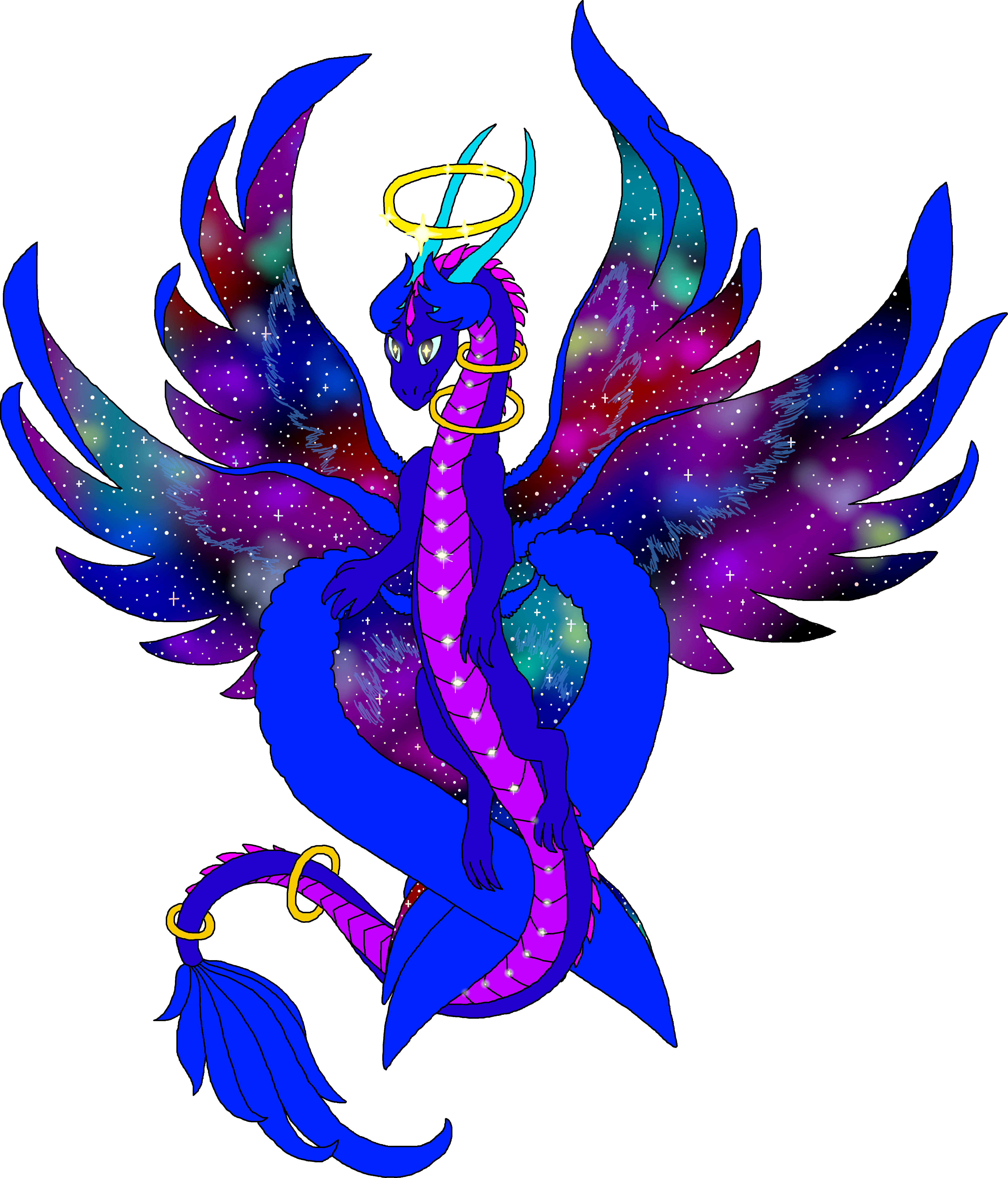 Adult: Its halo glows with sparkling stars that represent the dragon’s power. Floating rings circle its neck and tail without regard to gravity, showing its connection to space. Caelestia’s wings contain a unique galaxy of stars and space, and its divinity is apparent in its angelic feathers. It calls the whole universe its home, and travels to many worlds to bring that wonder and glory to others.