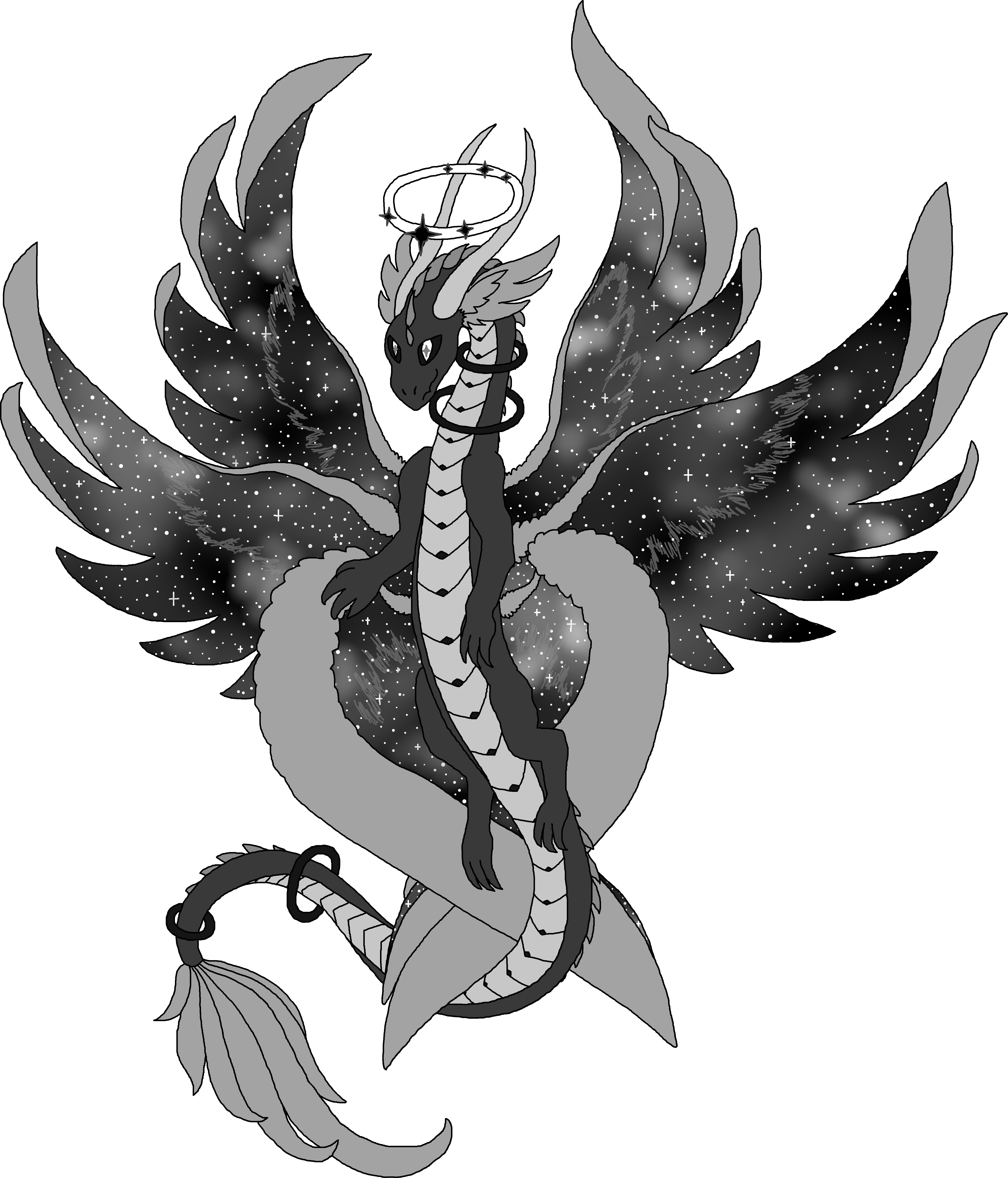 It is an angelic dragon born of the very essence that shapes the universe. Because of this, it has deific power, and is deeply in tune with the celestial expanse of space. It has its very own galaxy held within its feathers, with all the depth and beauty of a real night sky. The stars and constellations in each dragon are unique.