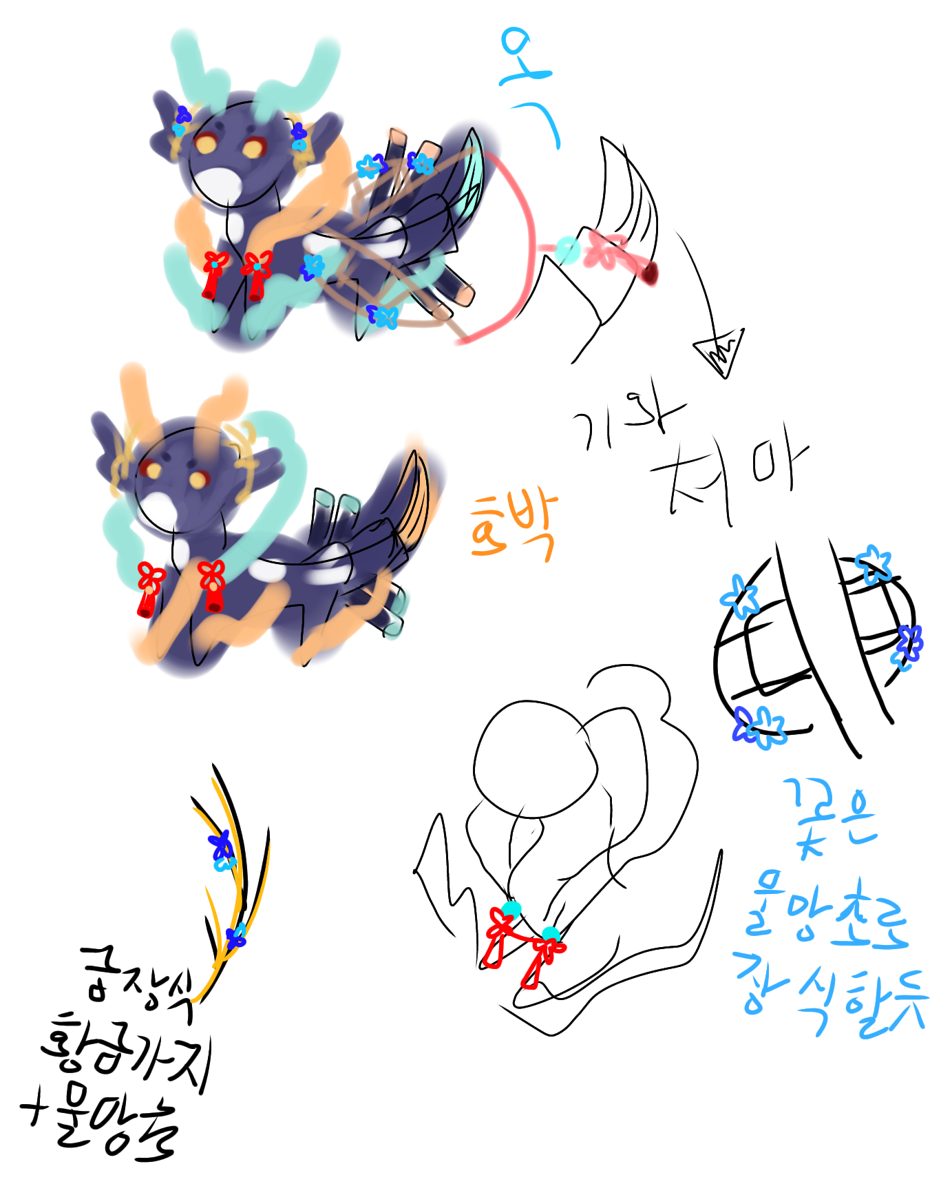 물망초가 뜻하는 꽃말 ‘나를 잊지 마세요.’ 를 반영해서 그리움과 관련된 모티브인 만큼 물망초도 디자인에 넣으려고 했었던 초기컨셉아트.. 최종적으로는 빠지게 되었네요..🥲