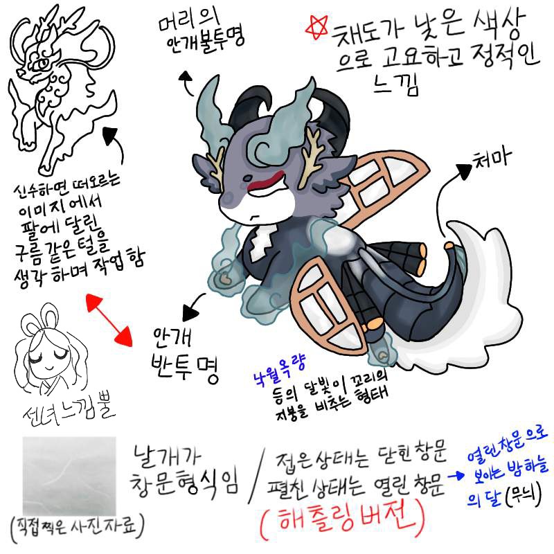 옥량은 등에 굳게 닫혀 있던 미닫이식 창문 형태의 날개를 서서히 펼치자 마치 창문이 열리는 느낌으로 숨겨져 있던 달빛 무늬를 조금씩 드러내기 시작했다.