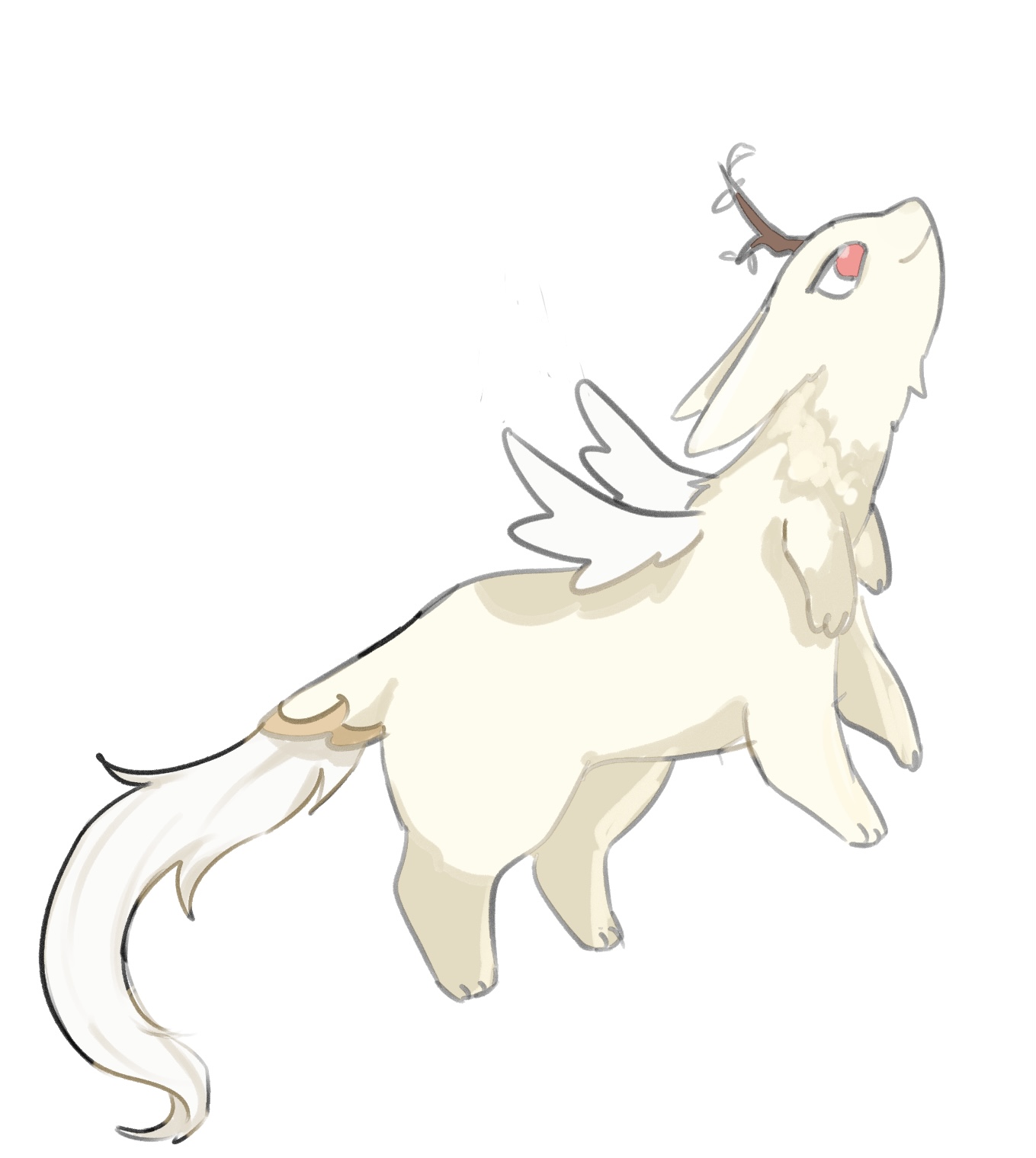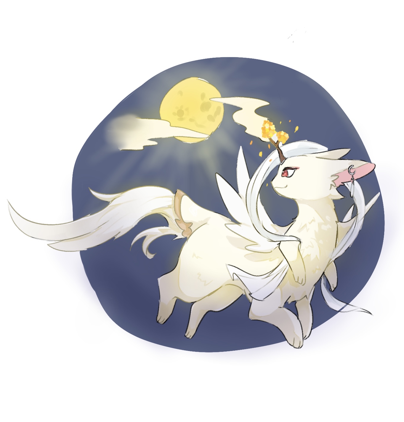 額の角に金木犀が咲き誇る。この花の香りが強いほど、魅力的なようだ。翼のような部分は退化しており、羽衣によって空を跳ねるように飛ぶ。尻尾の毛を美しく保つと喜ぶ。満月の夜に空を眺めていると、金木犀の花びらが落ちてくるかもしれない。