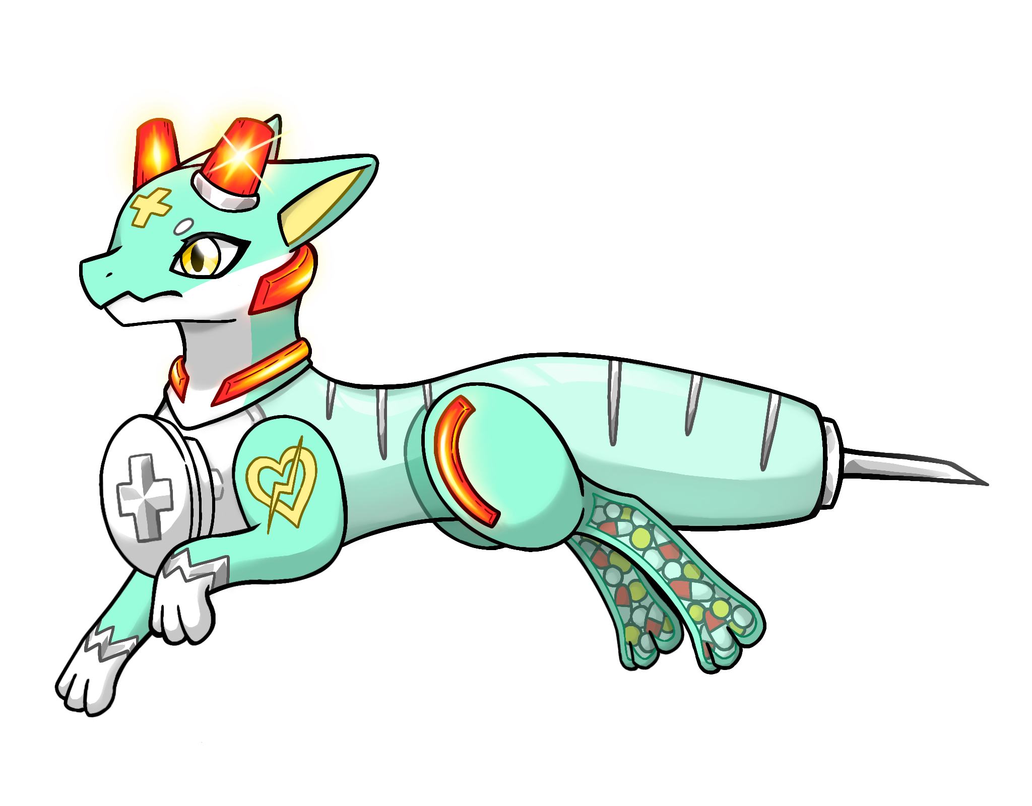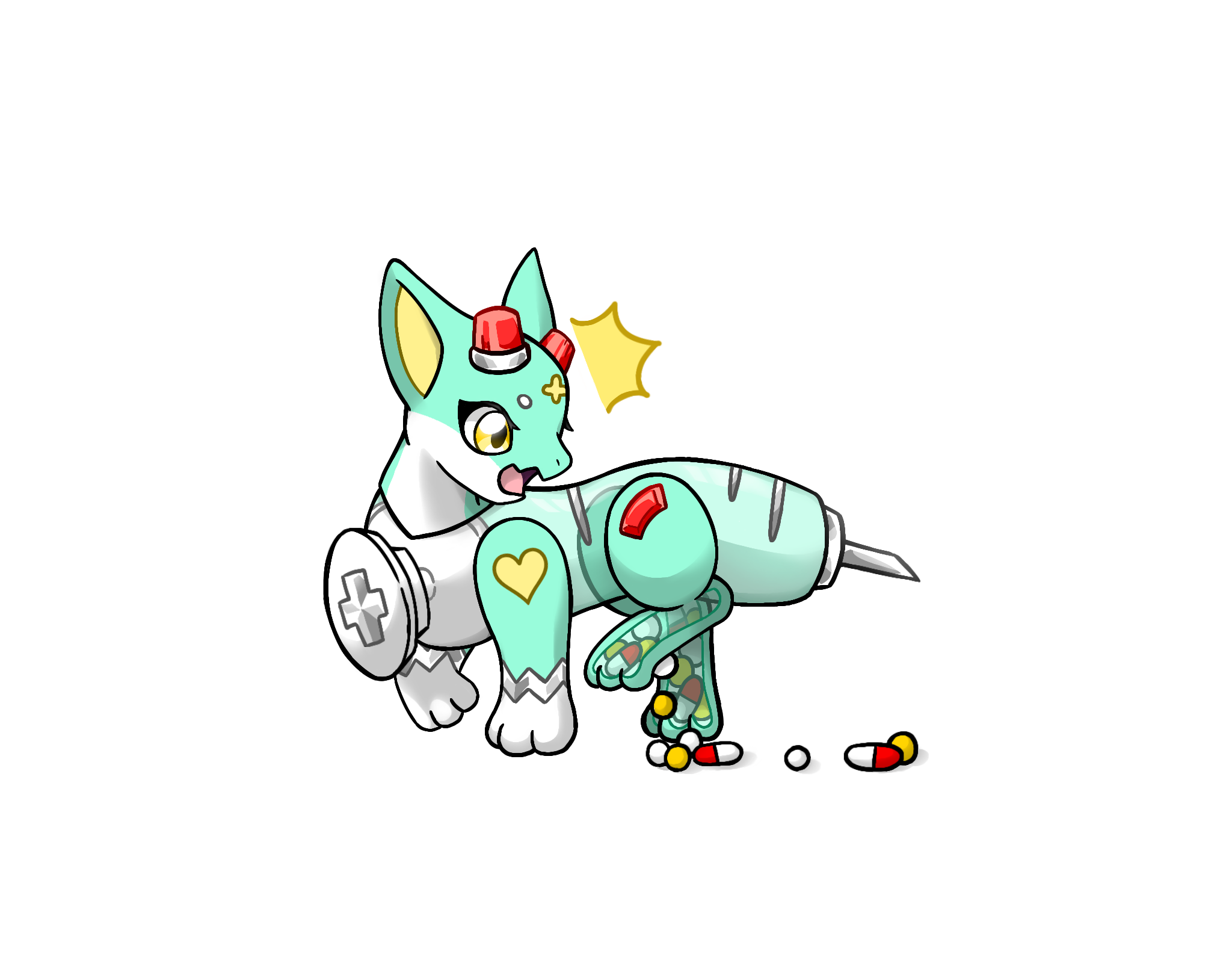 몸통은 주사기 형태로 되어있고, 뒷다리는 통처럼 속이 비어있어서 몸통에는 약물, 뒷다리에는 알약을 보관할 수 있다. 그렇기에 각종 영양가있는 열매를 섭취하고, 체내에서 약품을 만들어서 몸에 보관한다. 필요할 때에는 가슴팍의 피스톤을 누르거나 뚜껑인 뒷다리 육구를 열어서 꺼낸다.