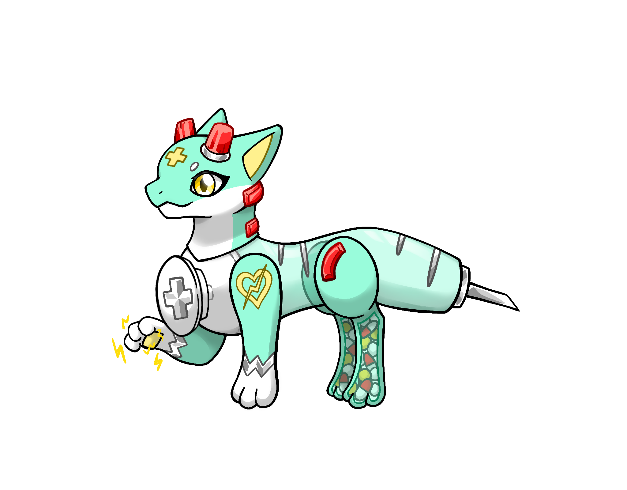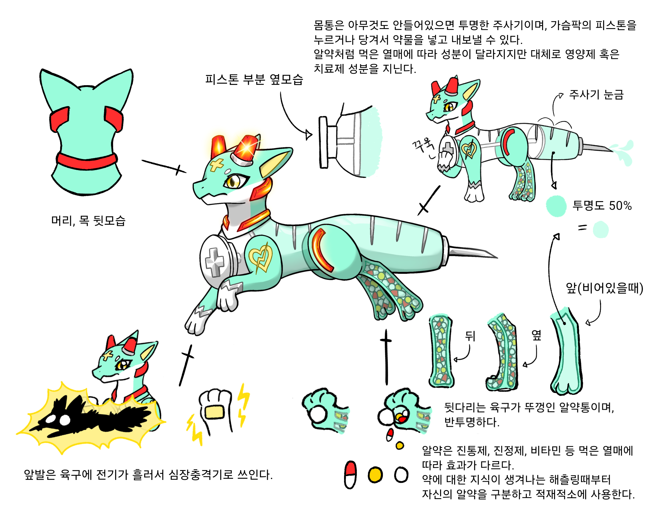 원래는 환자를 치료소같은 곳으로 이송한다는 설정으로 바퀴와 엔진같은 자동차 부품을 달아줬으나 응급치료를 해준다는 설정을 메인으로 잡아서 바퀴와 엔진은 과감히 버리고 주사기와 알약같은 의약품을 넣어줬습니다.