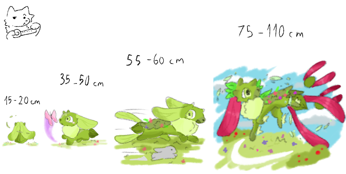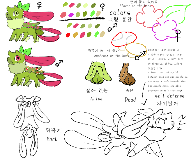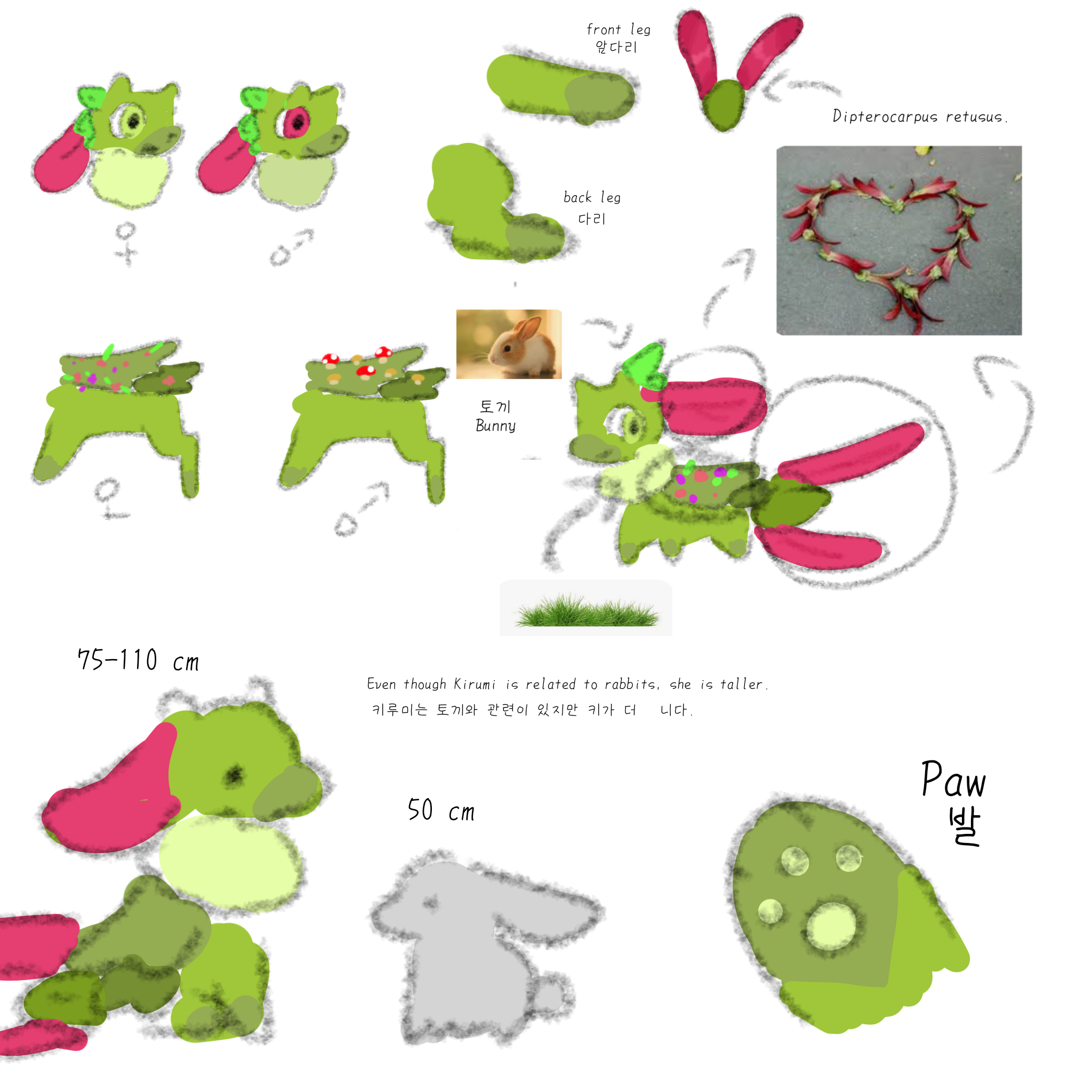 in the concept art, kirumi is taller than a rabbit when she is an adult (kirumi is the same height as a rabbit at the time she a hatch), and behind kirumi is like a grass field, they can grow flowers (if female) or mushrooms (if male), the eye color will also change depending on the gender. The tail and ears are made of brown seed (idk what it call) . at first glance, kirumi looks like a rabbit (actually I wrote "rabbit" as "bunny" in the concept art, it might be fixed, but rabbit is synonymous with bunny, right?) and has two tiny horns on her forehead.