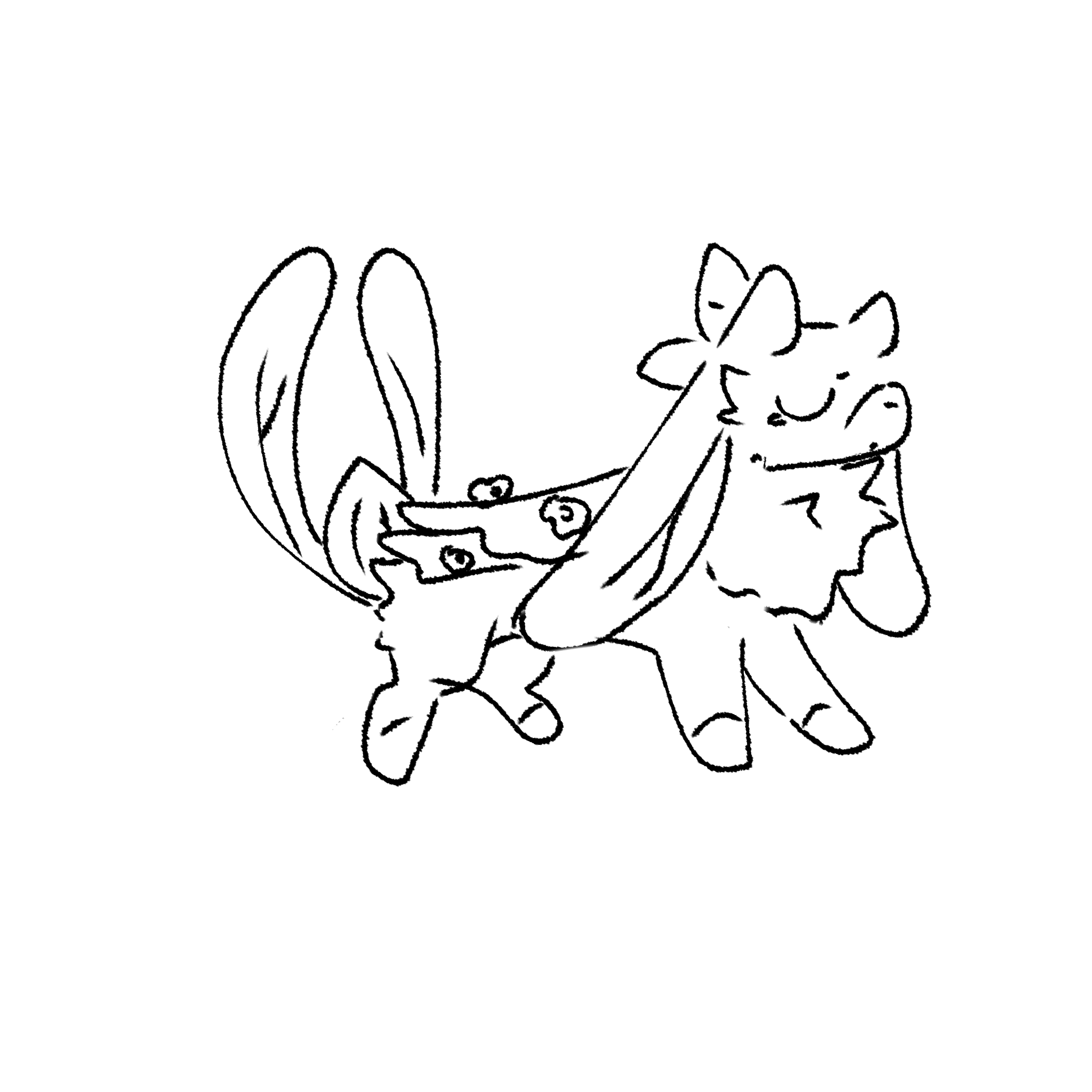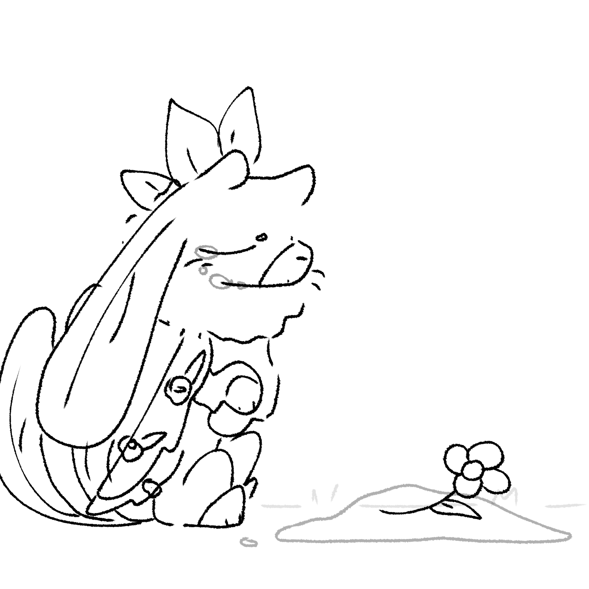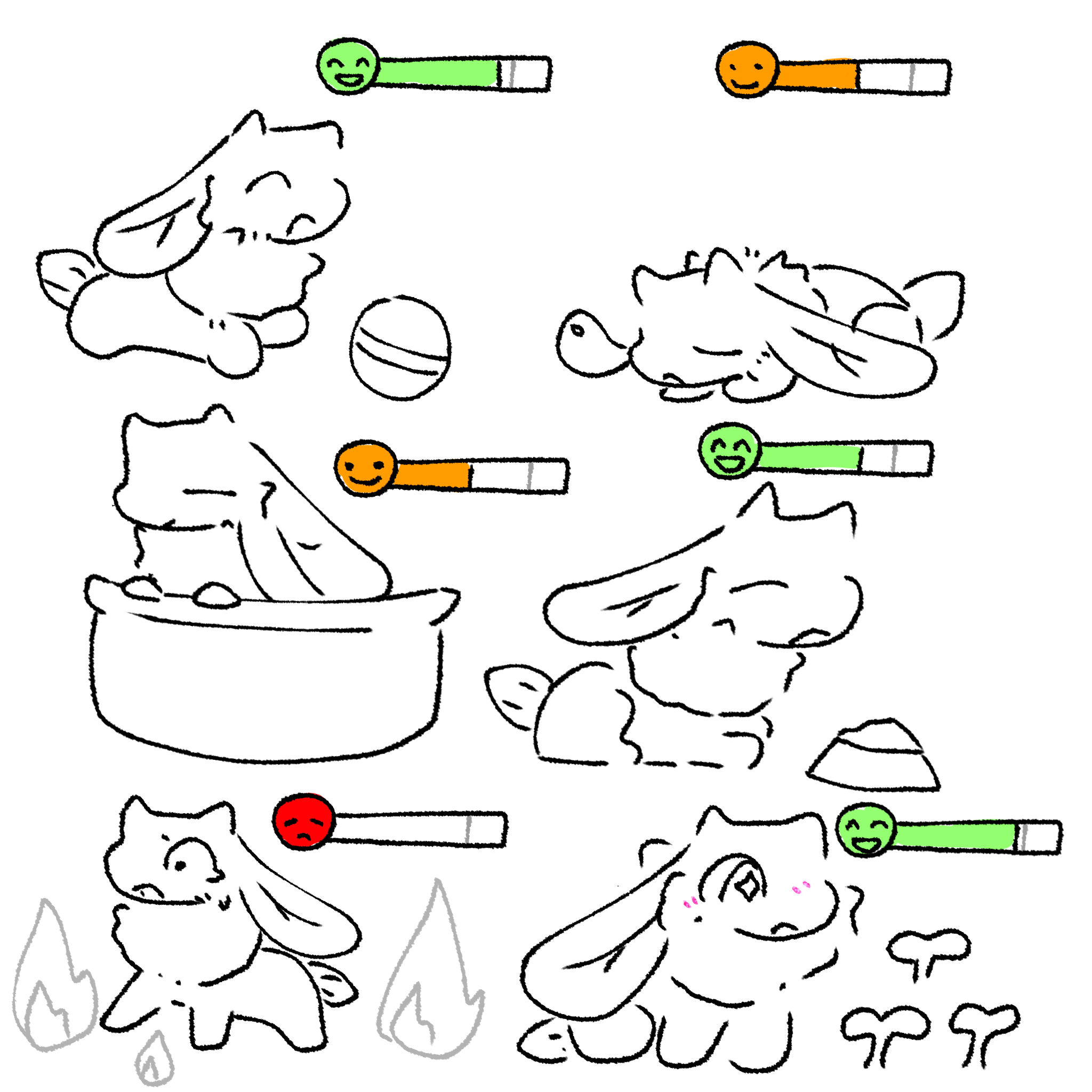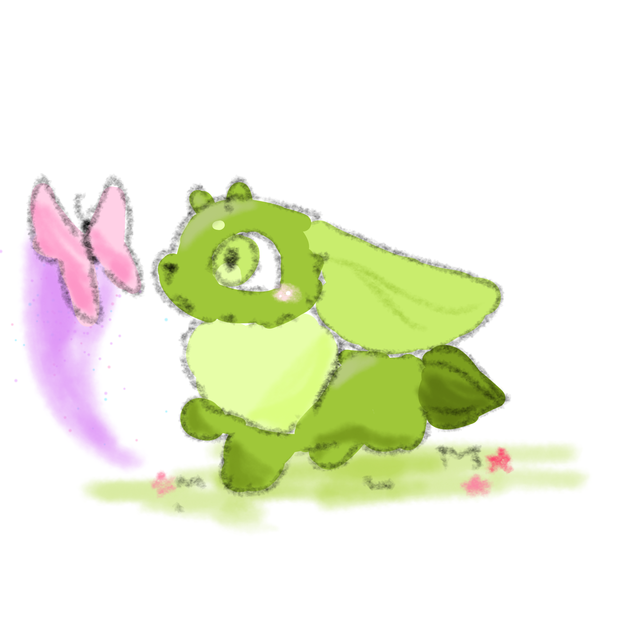 Kirumi hatches into a tiny creature with short, floppy ears that hang down at her sides. She is clumsy, often curling up in the grass or chasing butterflies. She also picks flowers by holding them in her mouth.