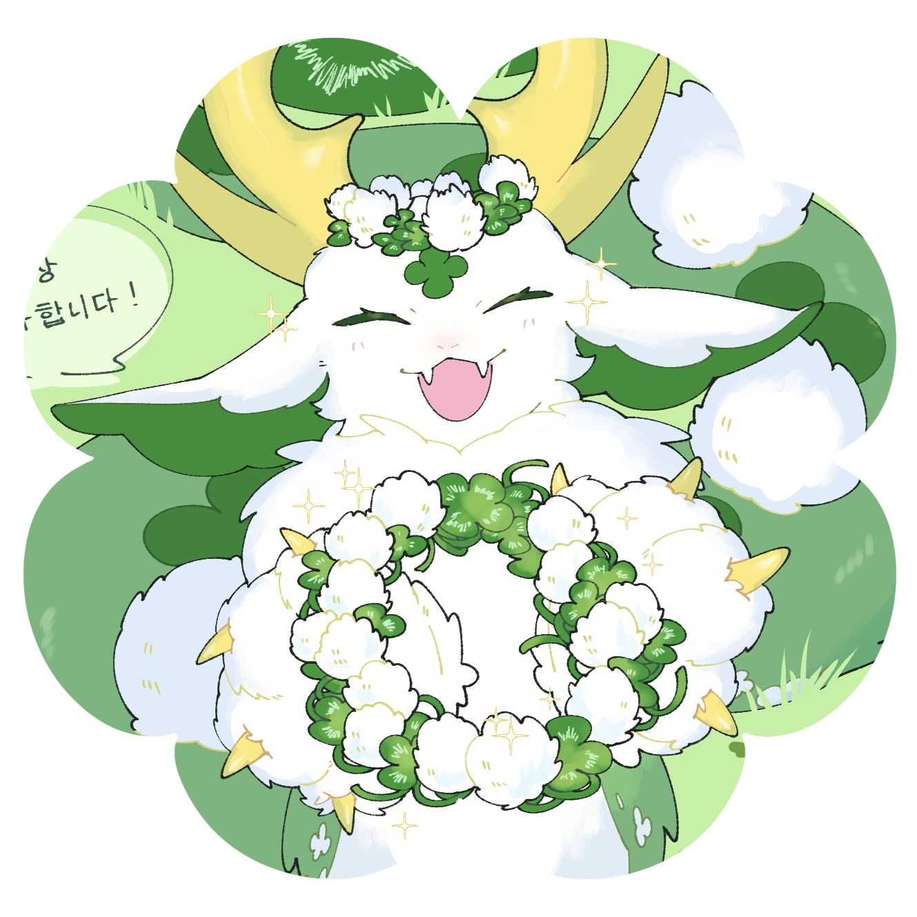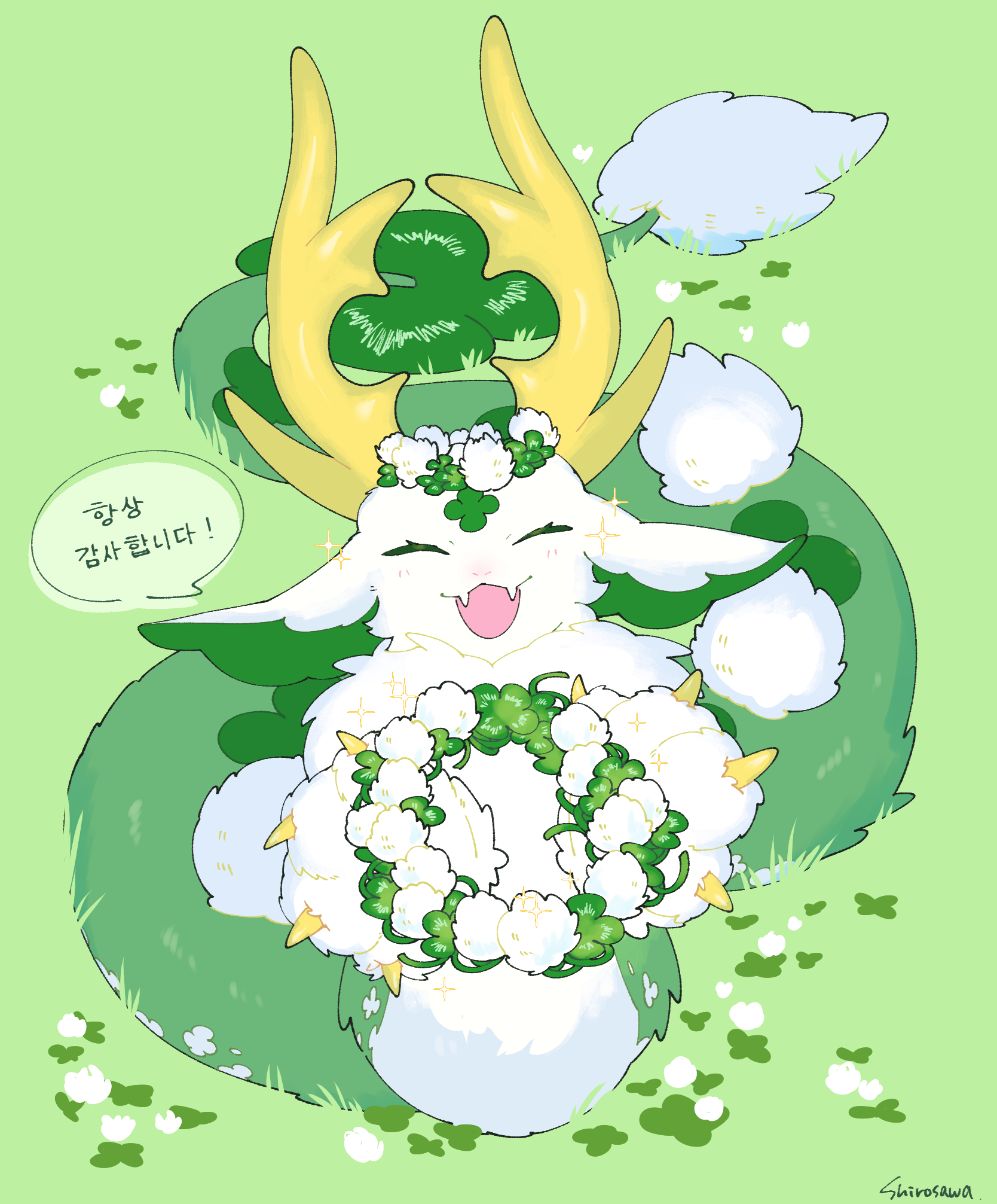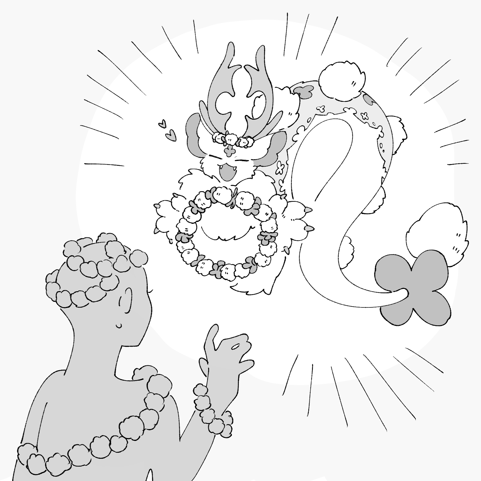 "행복"이라는 의미를 가진 네 입 클로버. 드래곤은 그것을 엮어 화관을 만들어 테이머에게 선물하려고 생각했지만, 잘 만들지 못한다…
