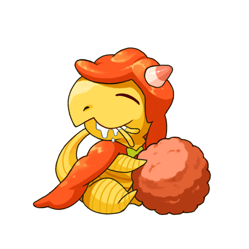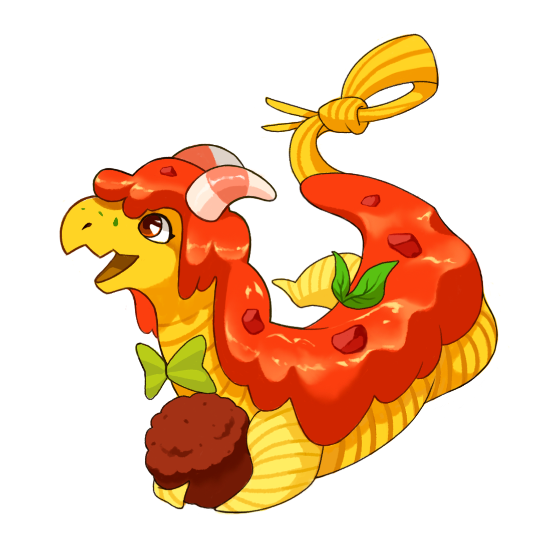 머리에는 새우 살로 보이는 작은 뿔이 돋아있다. 가끔 자신의 몸이 파스타 면으로 이루어져 있다는 것을 망각하는지 꼬리를 입에 문채 잘근거리곤 한다. 태어날때부터 갖고있던 덜익은 미트볼을 보물처럼 여긴다. 브레스를 연습하여 미트볼을 골고루 익히려고 한다.