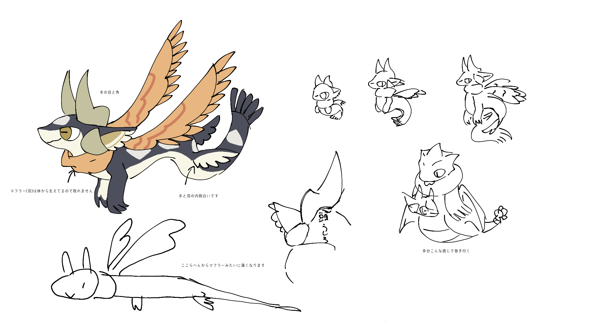 목도리용은 양과 뱀을 모티브로 디자인했습니다. 뱀을 목에 감는 것처럼 목에 감겨 오는 드래곤이 있으면 재미있을 것 같다고 생각해 컨셉을 생각했습니다.