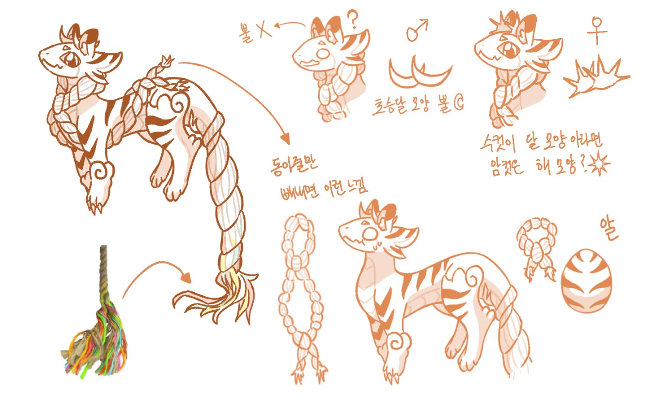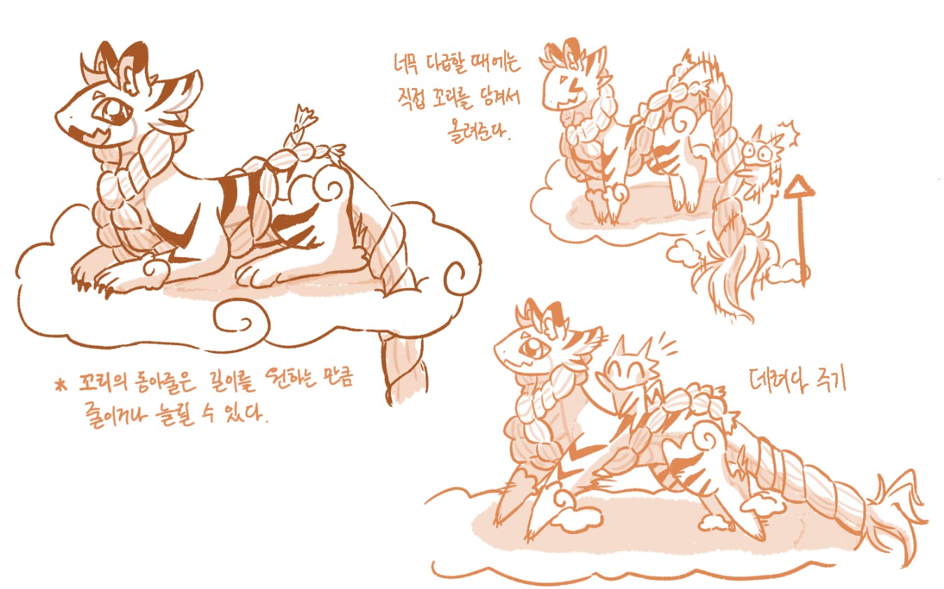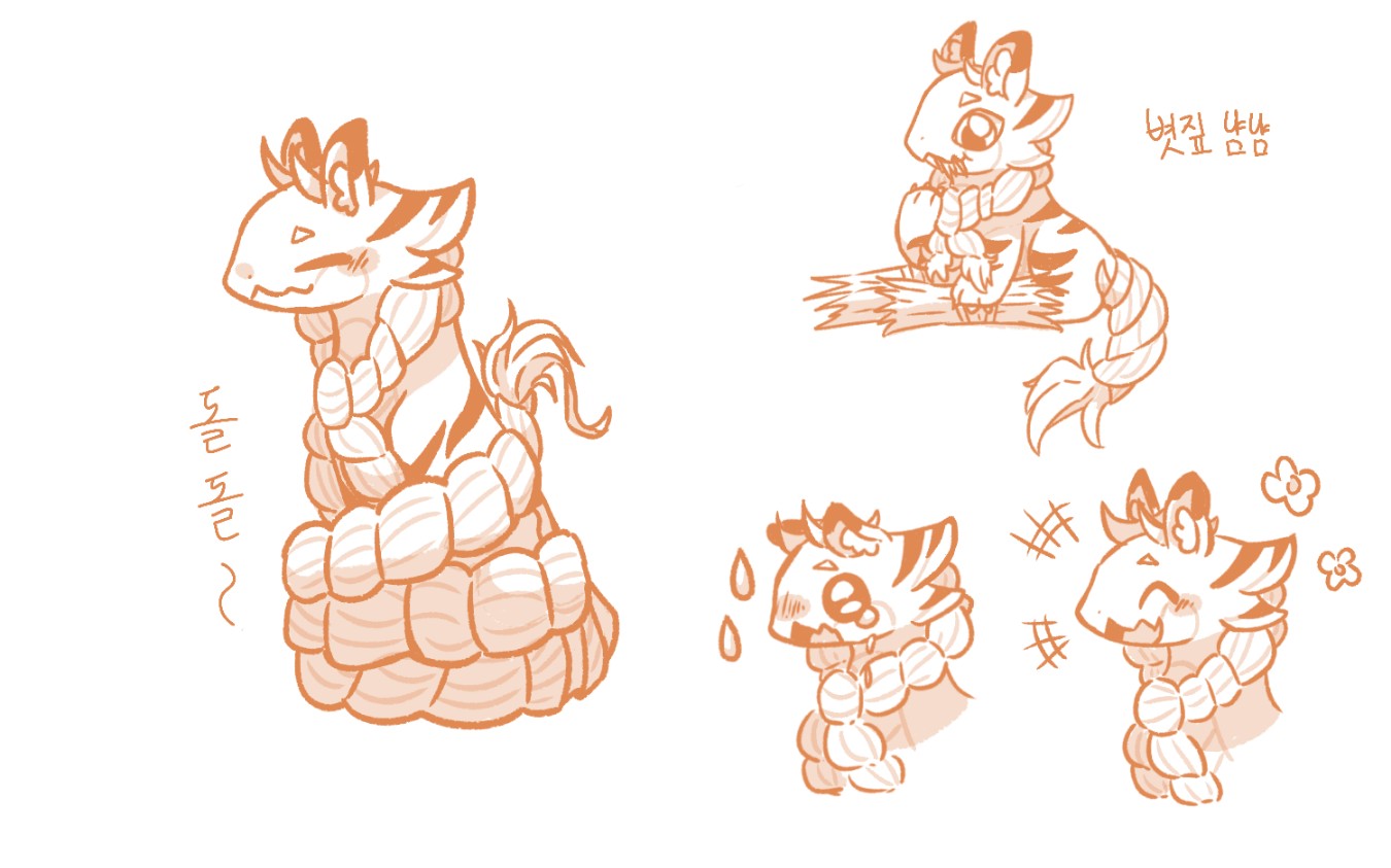 원래는 오누이가 해와 달을 닮은 용이 되면 어떨까에서 출발했지만, 약간의 변형을 주고 싶어서 호랑이를 기존의 쫓는 입장에서 쫓기는 입장으로 바꿔봤습니다.