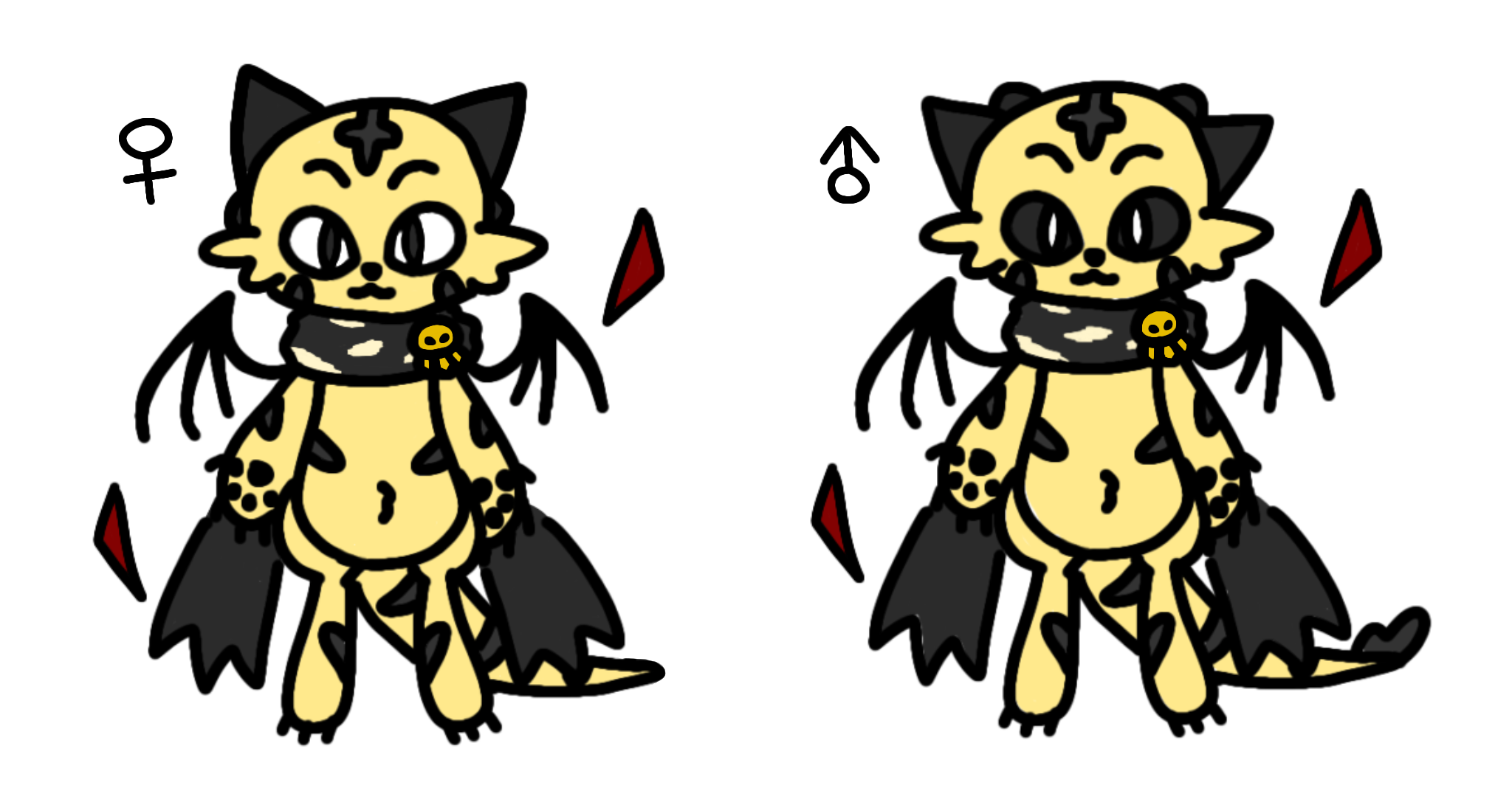 ♀は虎寄りの姿、♂は龍寄りの姿になります。大きく変わるのは目や角で、尻尾の先にも違いがあります。肉球は絵では黒ですが設定上ではピンクです。