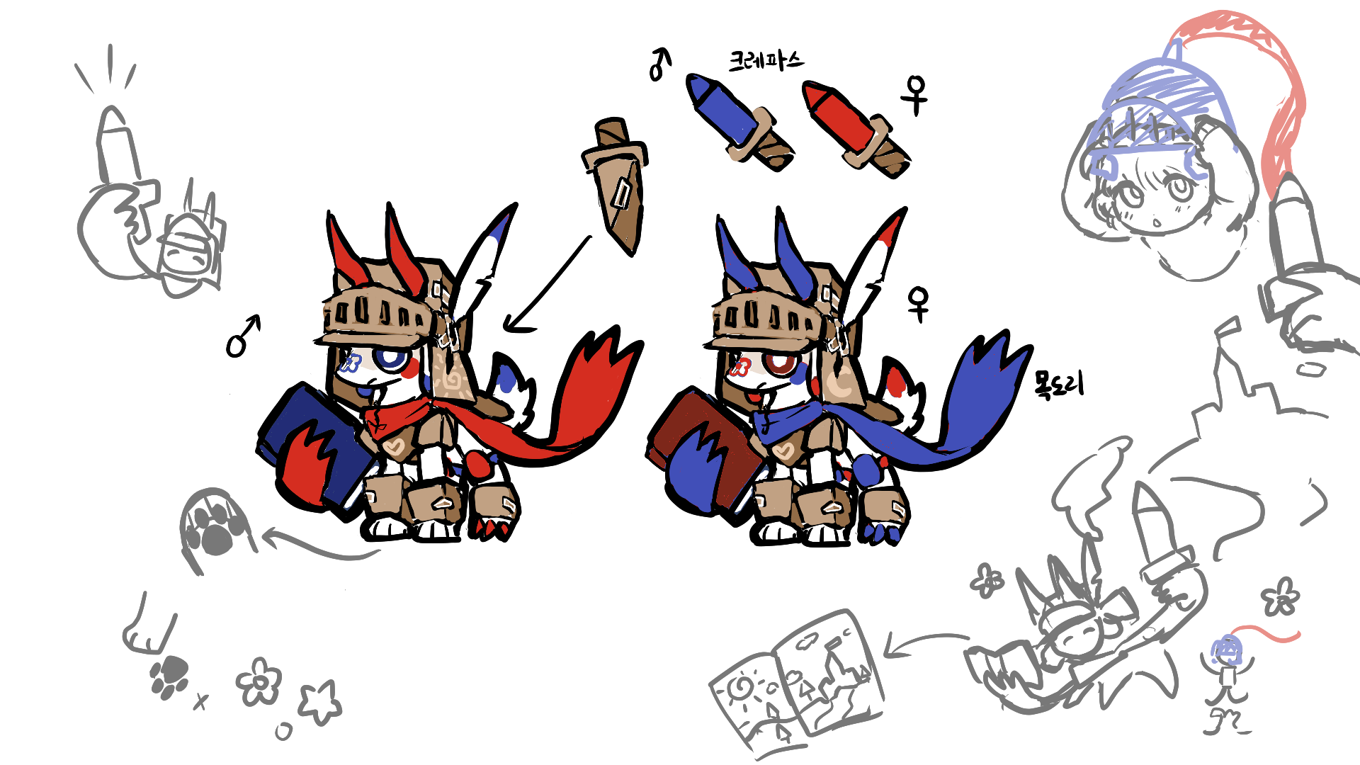 파믈로(암수)가 파랑과 빨강인 이유는.. 제가 어린시절에 알던 기사는 빨강과 파랑뿐이어서 그렇게 정했던듯 하네요