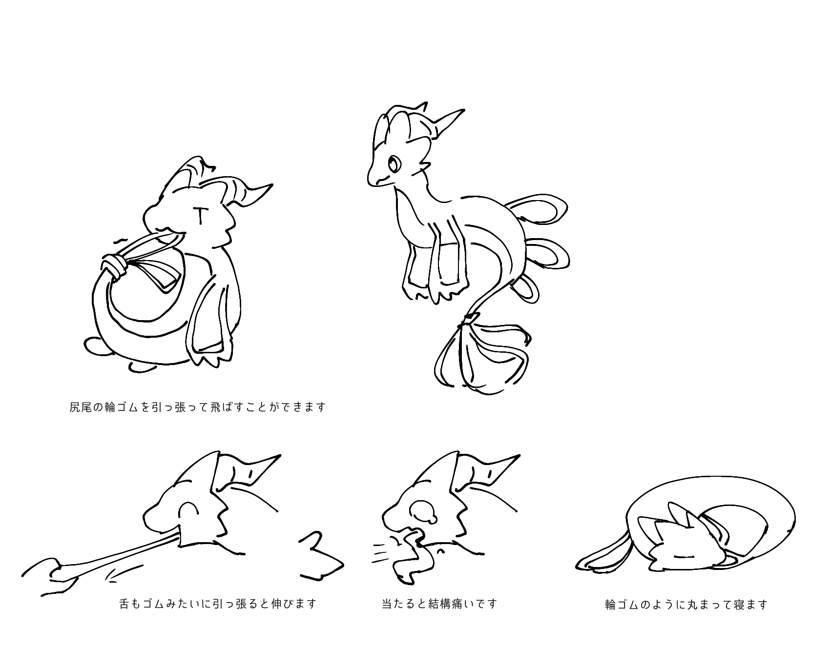놀고 있을 때 고무를 날리는데 몇 번이나 실패했던 것, 너무 놀고 고무가 끊어진 것이 많이 있었던 것을 기억해, 장난을 좋아하지만 많은 실패하는 캐릭터를 생각해 냈습니다.
