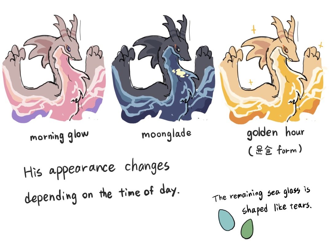 모래와 물 같은 유동적인 육체를 가집니다. 아직 어린 상태이기에 움직일 때마다 몸의 형태가 조금씩 변하며, 그것을 바로잡는 데 애를 먹습니다. 매우 겁이 많은 성격으로, 다가오는 이가 있으면 순식간에 몸을 무너뜨려 해변의 모래사장에 의태합니다. 직접적으로 모습을 보기는 어렵지만, 모래사장에 남겨진 파도 흔적으로 그의 존재를 알 수 있습니다.
