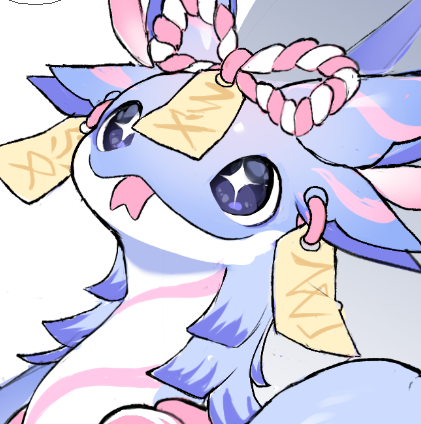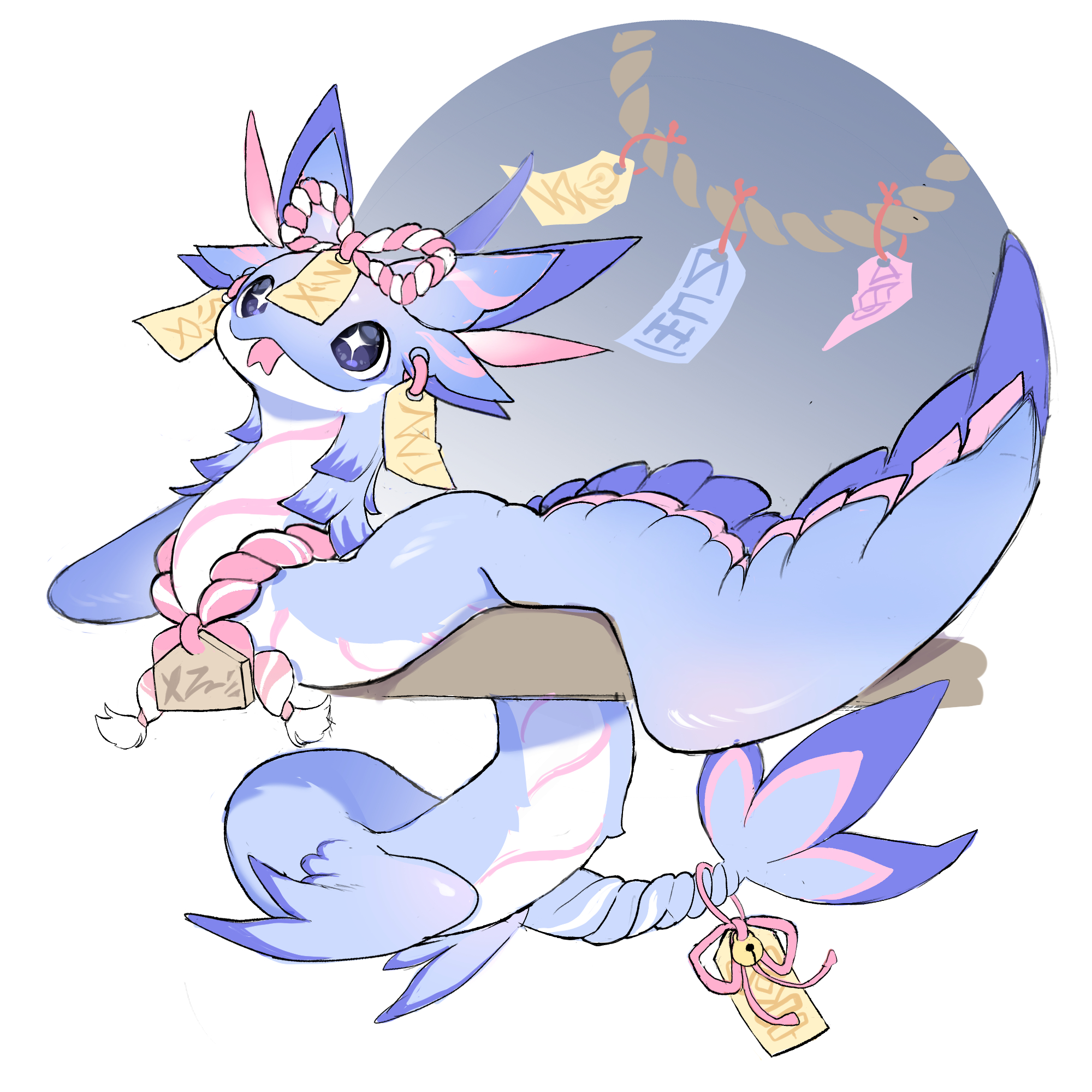 좀 더 동양풍스럽고 여우 비슷한 느낌으로 구상했는데 왠지 모르게 이카로스랑 피나타가 섞인 느낌이 들어서 다른 영물인 뱀으로 바꾸었습니다. 초안 당시 대나무 배 갑주와 소원종이가 위에 털처럼 자라있는 디자인이었는데 이건 이거대로 구현이나 그리기가 어려울 것 같아서 바꾸길 잘 한 것 같아요.