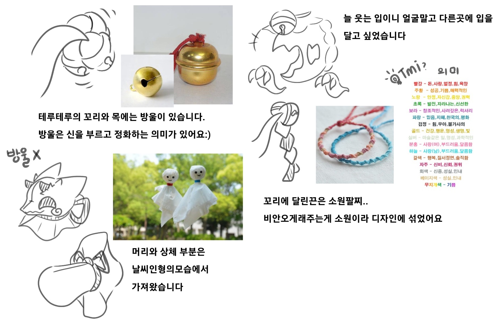 기우제 물론 날씨인형은 맑은 하늘을 기원하지만 기우제에 방울 쓰던게 생각나 꼬리 쪽과 목쪽에 달게 되었어요.