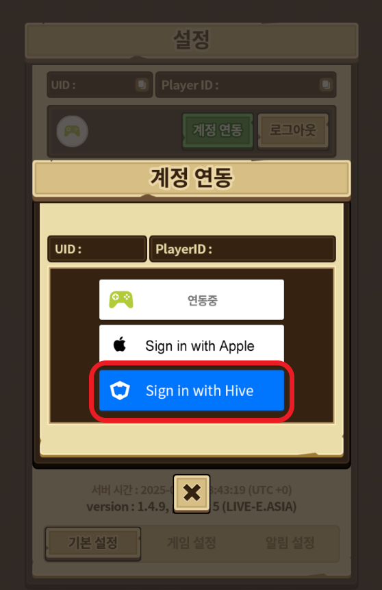 - Hive 계정 연동은 기존의 구글 이메일, 애플 계정과 같이 게임 계정과 연동하여 다른 기기 환경에서도 자유롭게 접속하실 수 있게 합니다.