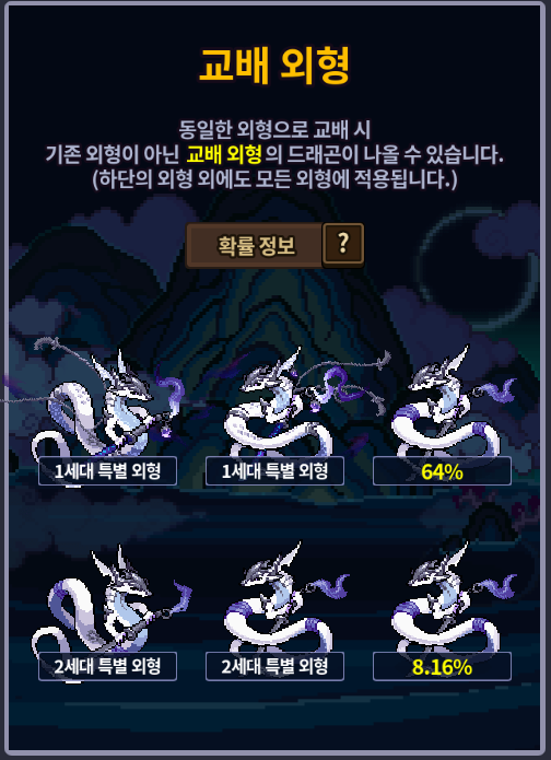 교배를 통해 획득할 수 있는 2세대 드래곤은 일반/특별 외형이 있으며, 2세대 드래곤은 외형과 관계없이 거래가 가능합니다.