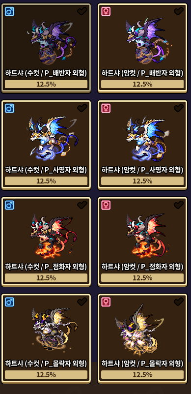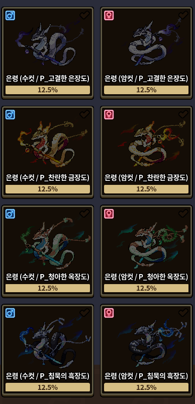 다음의 외형은 교배를 통하여 획득하실 수 있으며 거래가 가능합니다.
