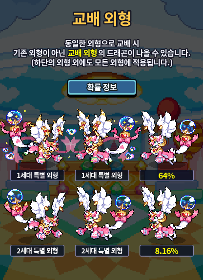 동일 외형의 특별 외형 2세대 간 교배 시, 해당 외형과 동일한 특별 외형 이달의 알을 획득할 수 있습니다.