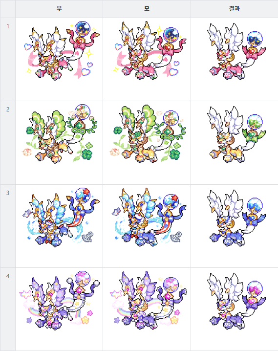 * 전용 교배 공식은 위에 설명된 것과 같이, 모두 동일 외형 교배시에만 해당하는 점 참고 바랍니다.